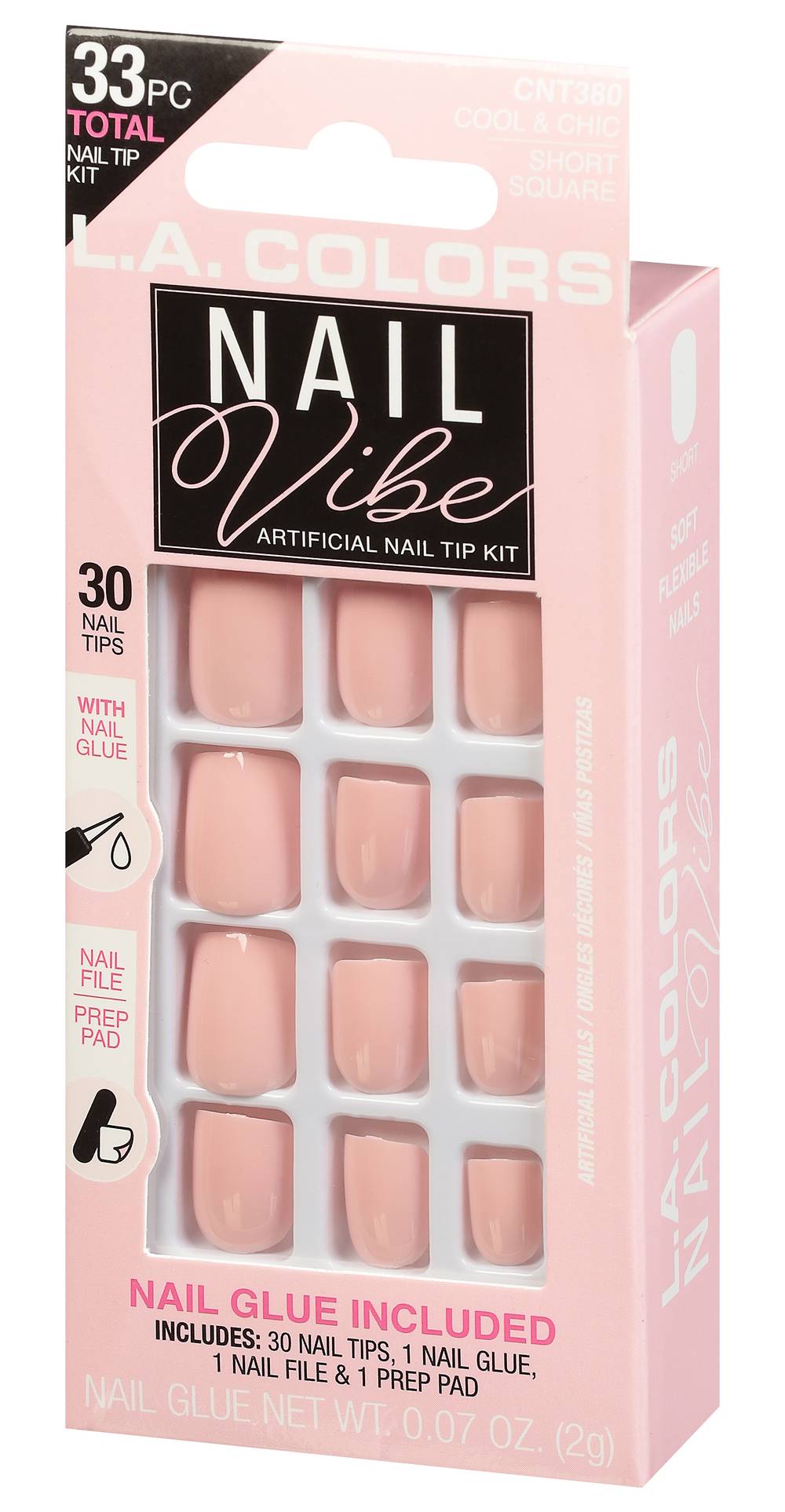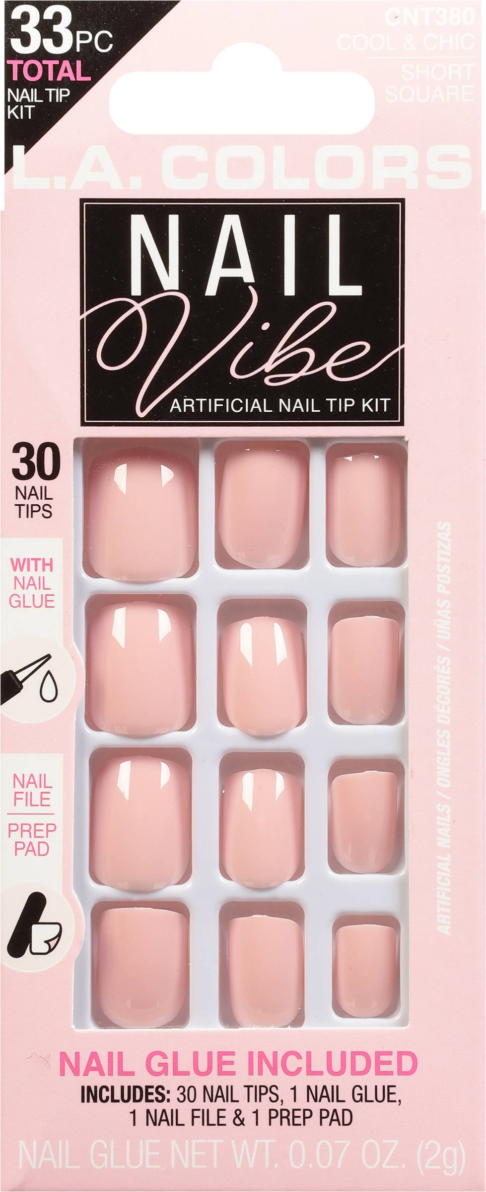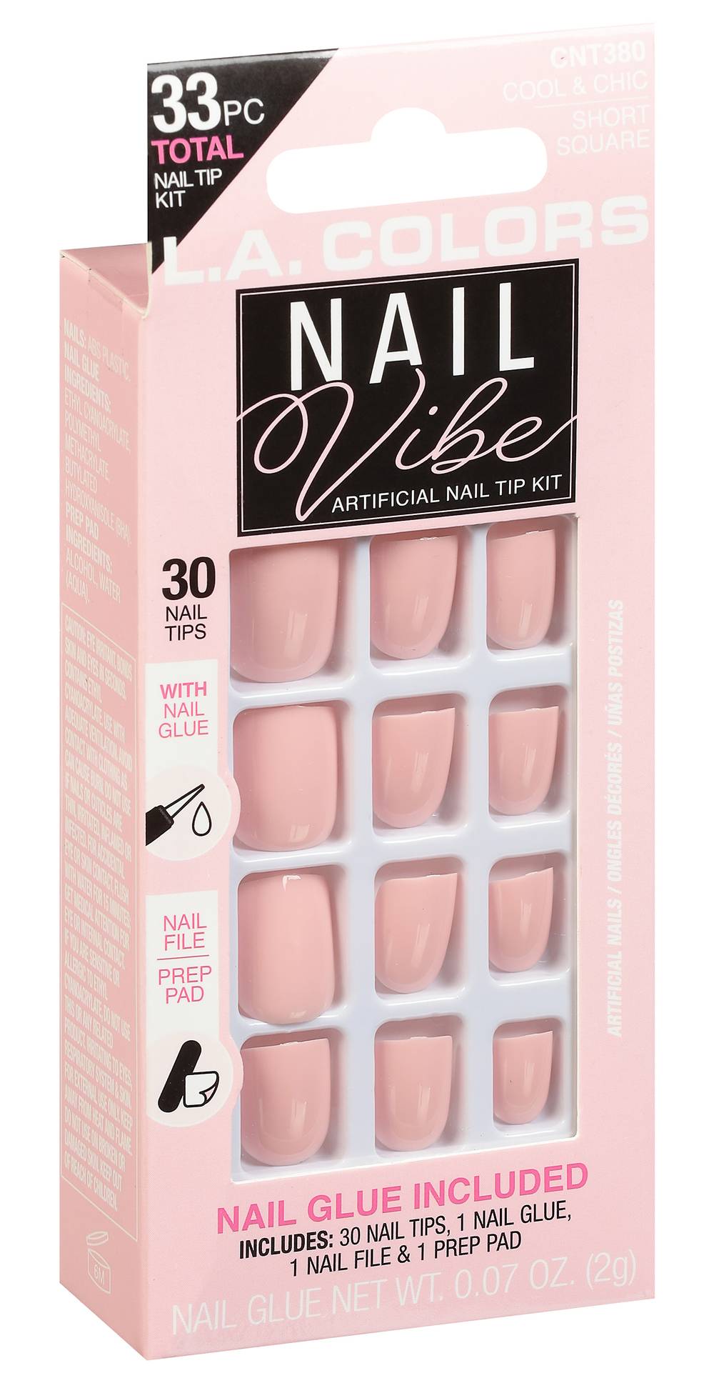 33pc Total Nail Tip Kit. 30 Nail Tips with Nail Glue; Nail File; Prep Pad. Nail Glue Net Wt 0.07 oz. (2g). Includes: 30 Nail Tips, 1 Nail Glue, 1 Nail File & 1 Prep Pad. Nail glue included! Soft flexible nails. Cool & chic. Short square. www.lacolors.com. Designed in USA. Made in China. Size: 1 CT