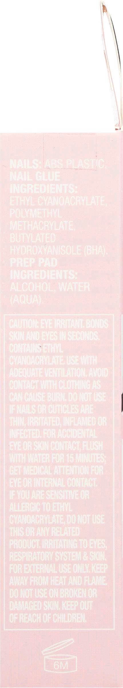 Ingredients: Nails: ABS Plastic. Nail Glue: Ethyl Cyanoacrylate, Polymethyl Methacrylate, Butylated Hydroxyanisole (BHA). Prep Pad: Alcohol, Water (Aqua)