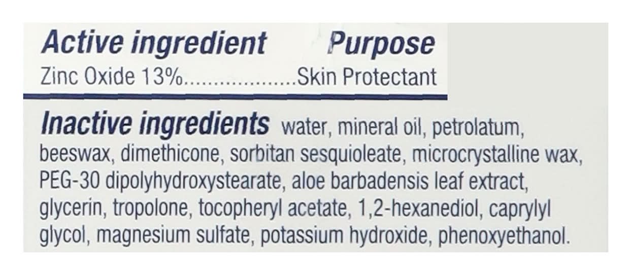 Ingredients: Active Ingredients: Zinc Oxide (13 %), Skin Protectant. Inactive Ingredients: Water, Mineral Oil, Petrolatum, Beeswax, Dimethicone, Sorbitan Sesquioleate, Microcrystalline Wax, PEG-30 Dipolyhydroxystearate, Aloe Barbadensis Leaf Extract, Glycerin, Tropolone, Tocopheryl Acetate, 1, 2-Hexanediol, Caprylyl Glycol, Magnesium Sulfate, Potassium Hydroxide, Phenoxyethanol Additives: Inactive Ingredients: Water, Mineral Oil, Petrolatum, Dimethicone, Sorbitan Sesquioleate, Microcrystalline Wax, PEG-30 Dipolyhydroxystearate, Aloe Barbadensis Leaf Extract, Glycerin, Tropolone, Tocopheryl Acetate, 1.2-Hexanediol, Caprylyl Glycol, Magnesium Sulfate, Potassium Hydroxide, Phenoxyethanol.