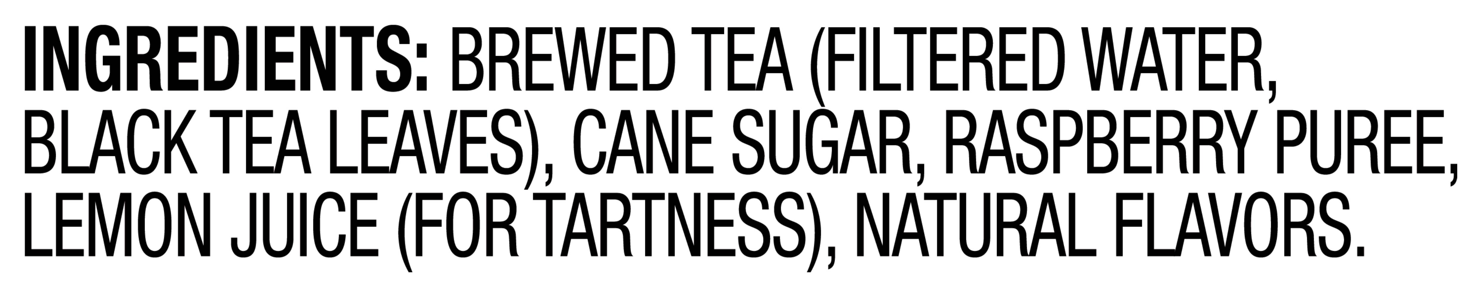 Ingredients: Brewed Tea (Filtered Water, Black Tea Leaves), Cane Sugar, Raspberry Puree, Lemon Juice (For Tartness), Natural Flavors.