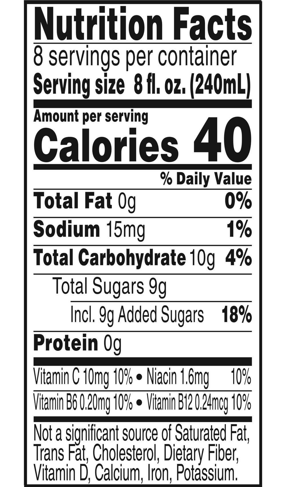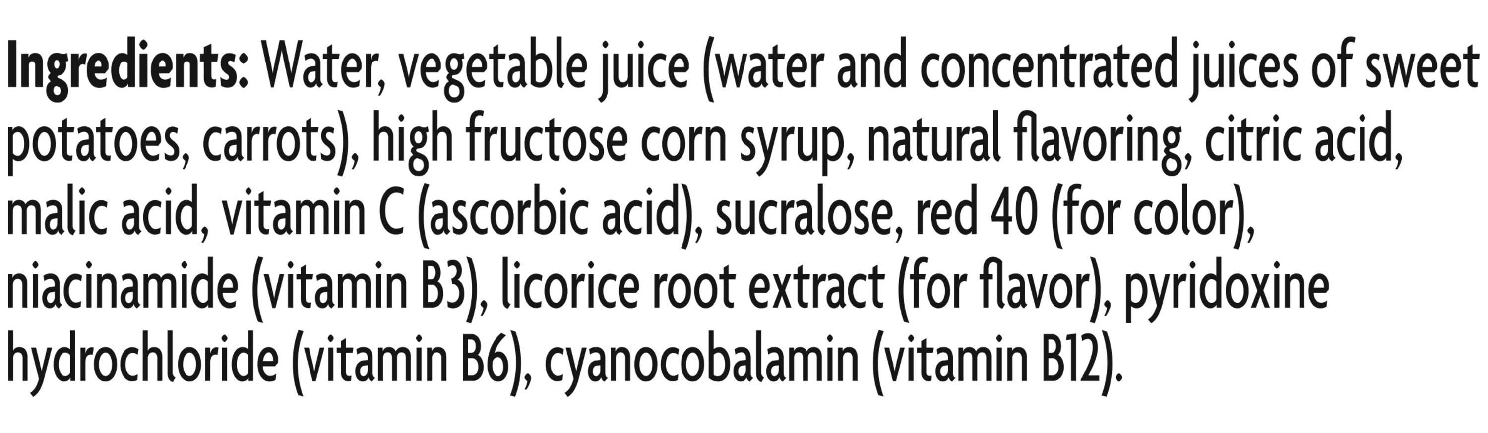 Ingredients: Water, Vegetable Juice (Water and Concentrated Juices of Sweet Potatoes Carrots), High Fructose Corn Syrup, Natural Flavoring, Citric Acid, Malic Acid, Vitamin C (Ascorbic Acid), Sucralose, Red 40 (for Color), Niacinamide (Vitamin B3), Licorice Root Extract (for Flavor), Pyridoxine Hydrochloride (Vitamin B6), Cyanocobalamin (Vitamin B12) Contains: Corn Additives: Genetically Modified Ingredients