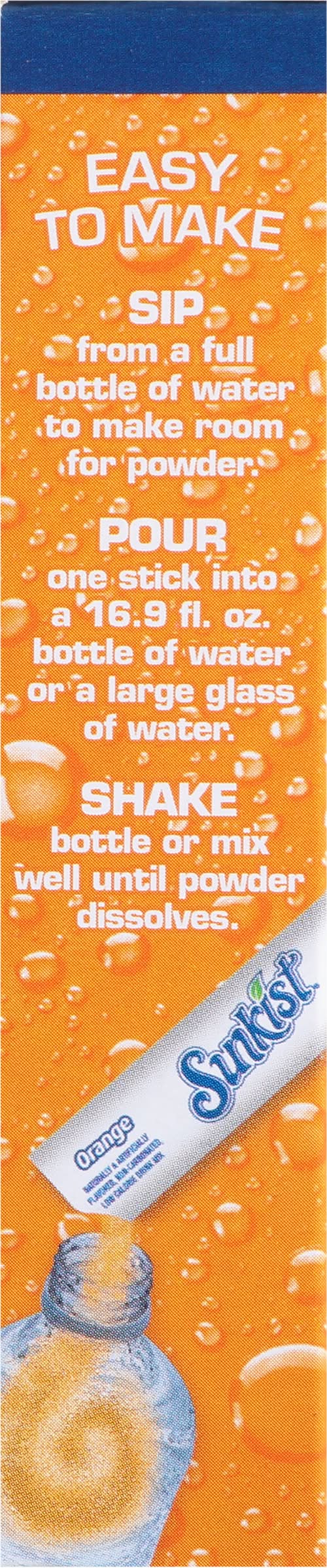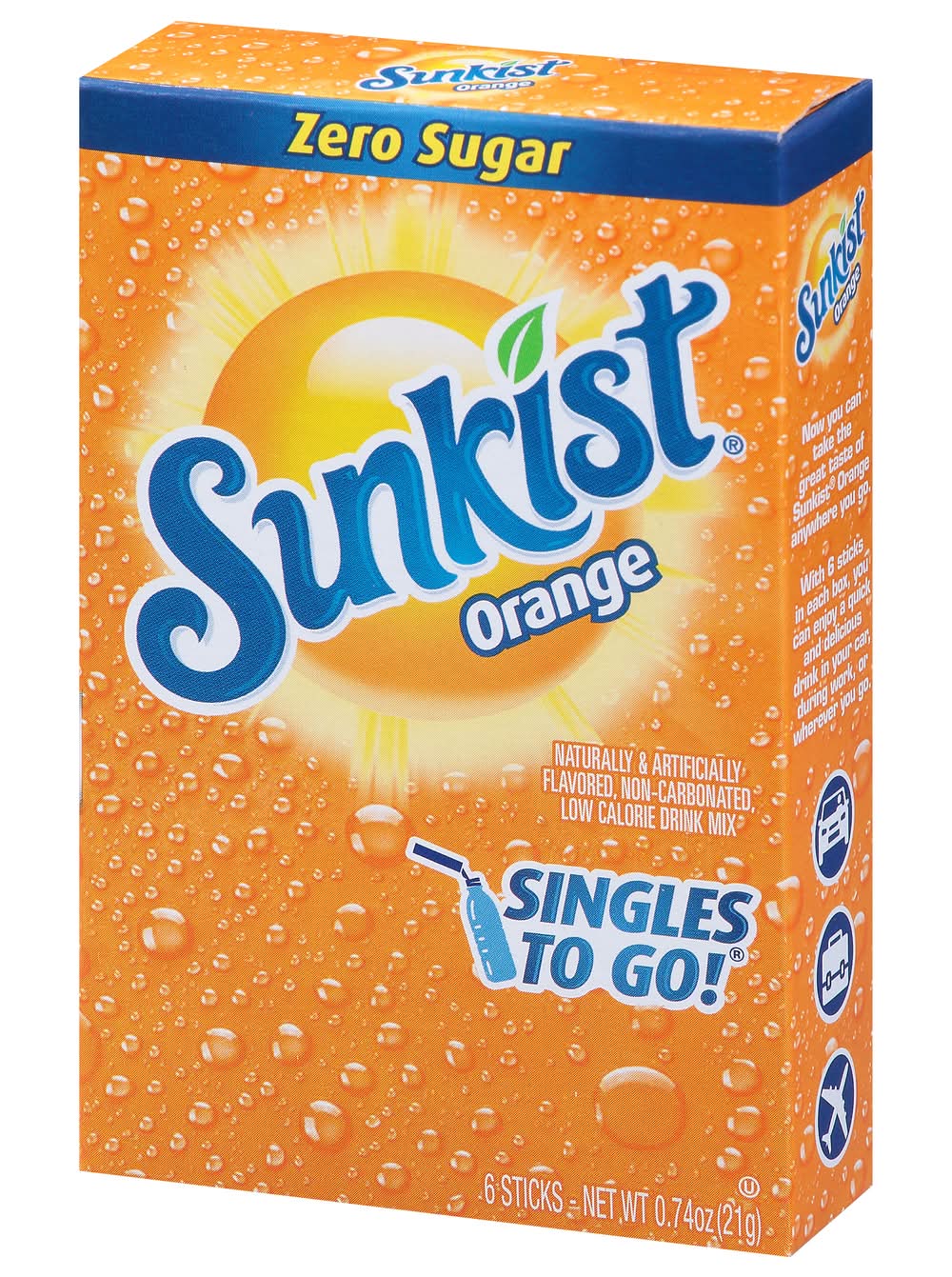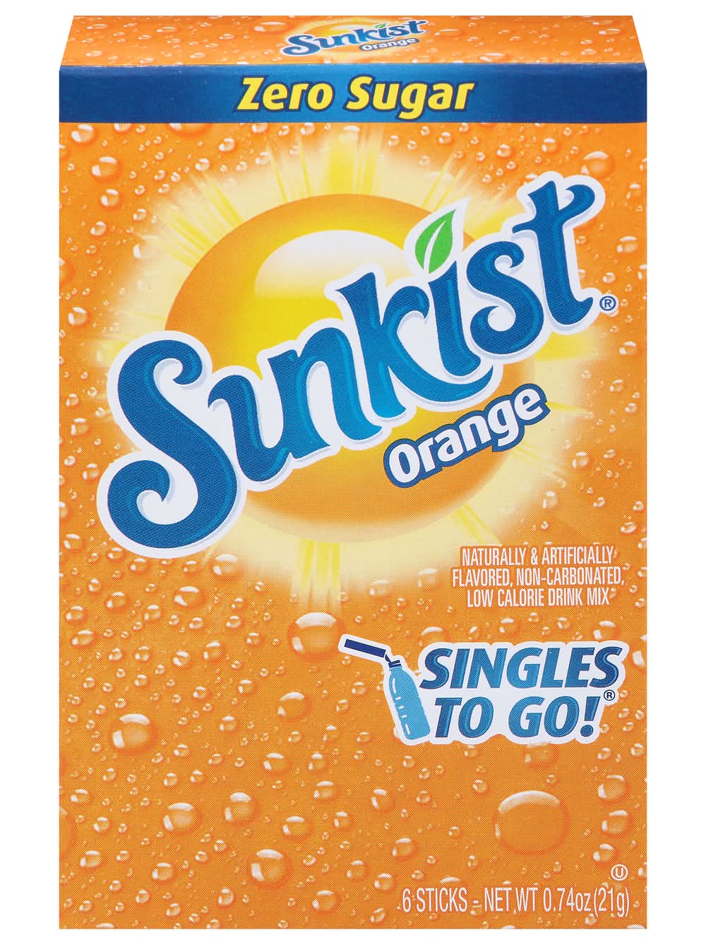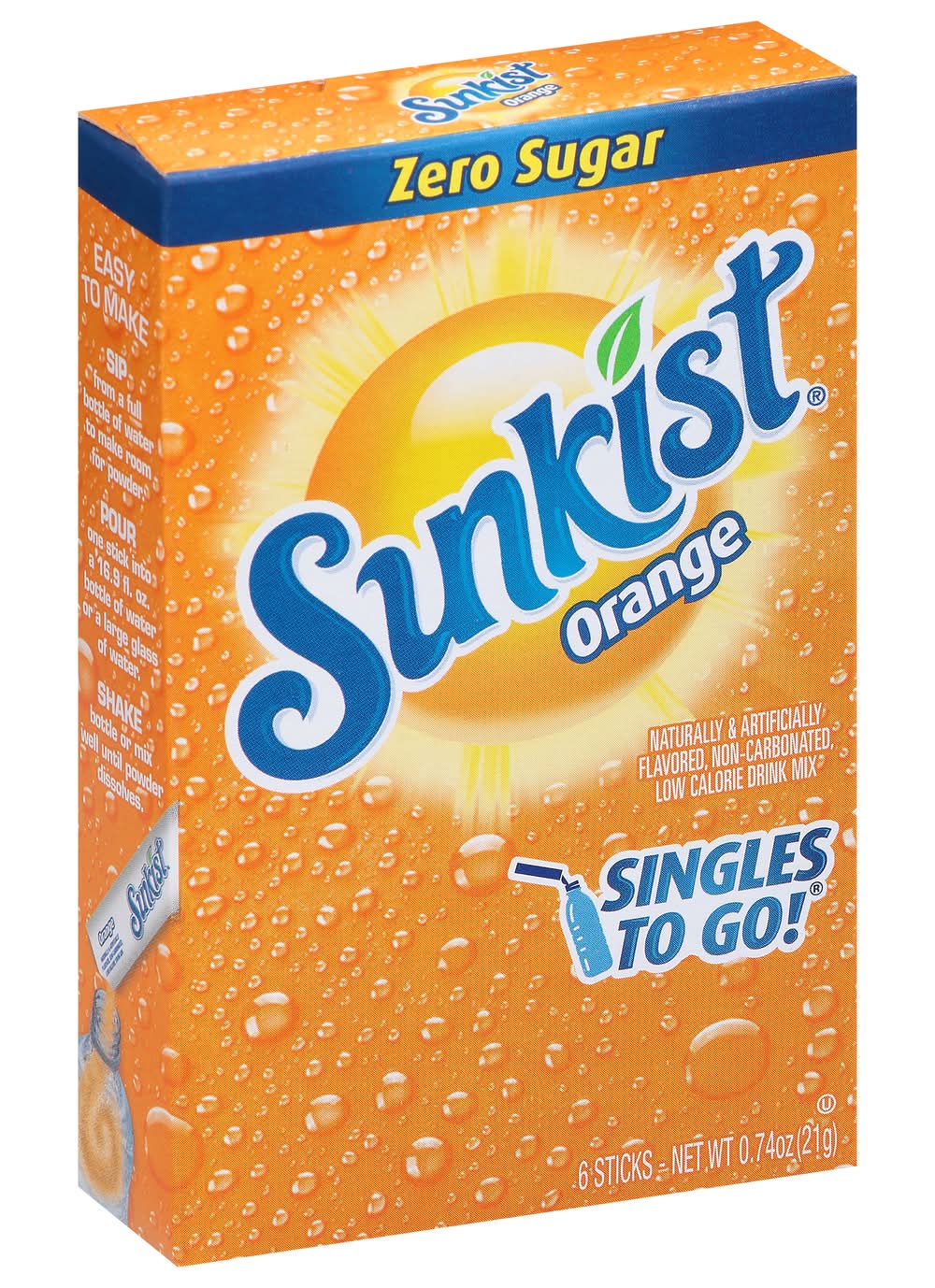 Naturally & artificially flavored, non-carbonated, low calorie drink mix. Zero sugar. Low calorie. Bioengineered. Contains caffeine. Now you can take the great taste of Sunkist Orange anywhere you go. With 6 sticks in each box, you can enjoy a quick and delicious drink in your car, during work, or wherever you go. • Flavor: Orange • The Jel Sert Company, West Chicago, IL, 60186