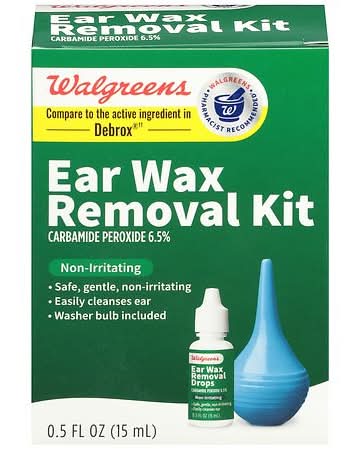 Walgreens Ear Wax Removal Kit contains carbamide peroxide at a concentration of 6.5% and is designed to be safe, gentle, and non-irritating for ear wax removal. The kit includes an ear washer bulb to aid in the cleansing process.