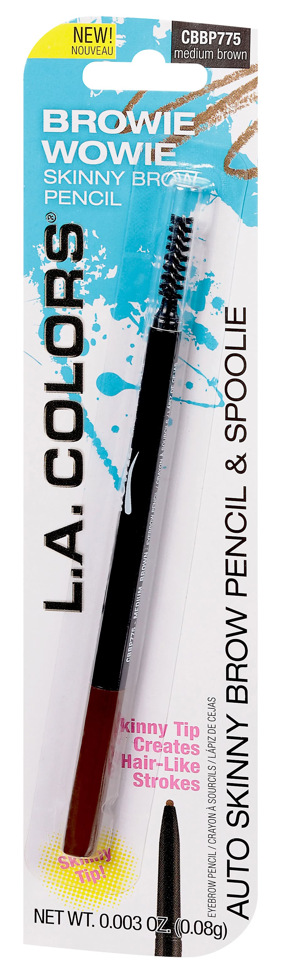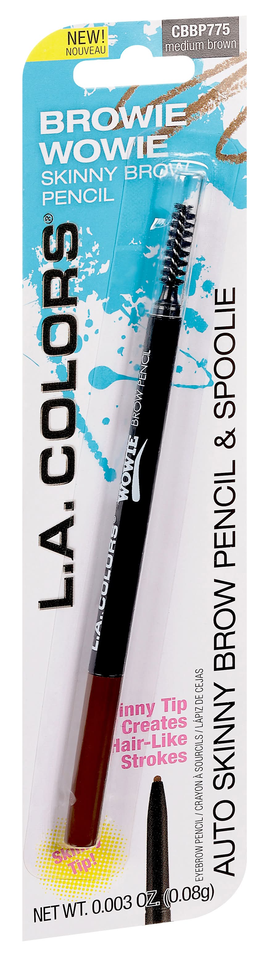 New! Browie Wowie. Skinny tip creates hair-like strokes. Skinny tip! Auto skinny brow pencil & spoolie. Skinny tip auto pencil creates hair-like strokes with ease. Includes spoolie. www.lacolors.com. Designed in USA. Made in China. • Color: Brown • Size: M