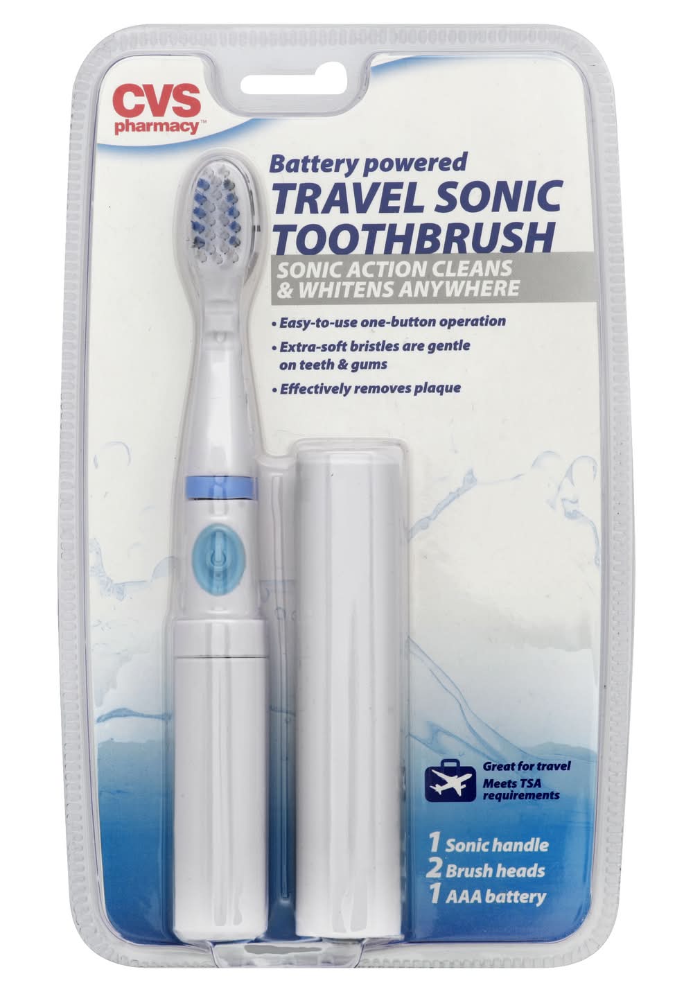 1 sonic handle, 2 brush heads, 1 AAA battery. Sonic action cleans & whitens anywhere. Easy-to-use one-button operation. Extra-soft bristles are gentle on teeth & gums. Effectively removes plaque. Great for travel. Meets TSA requirements. CVS/pharmacy Travel Sonic Toothbrush is small, compact and easy to use - it's perfect for use when you're on the go. Advanced sonic action of 32,000 vibrations per minute to reach deep between teeth. One-touch on/off button on handle for easy operation. Snap-on brush head cover protects brush head when not in use. Extra-soft bristles are gentle on teeth & gums. Effectively removes plaque. Meets TSA requirements. To stop the spread of germs, you should always replace your toothbrush after being sick with a cold or flu. CVS quality. CVS.com. Made in China. CVS,
