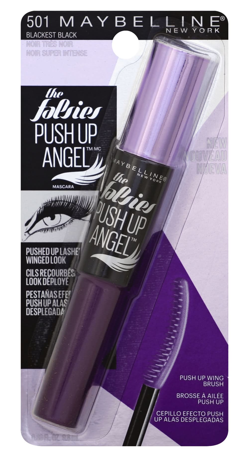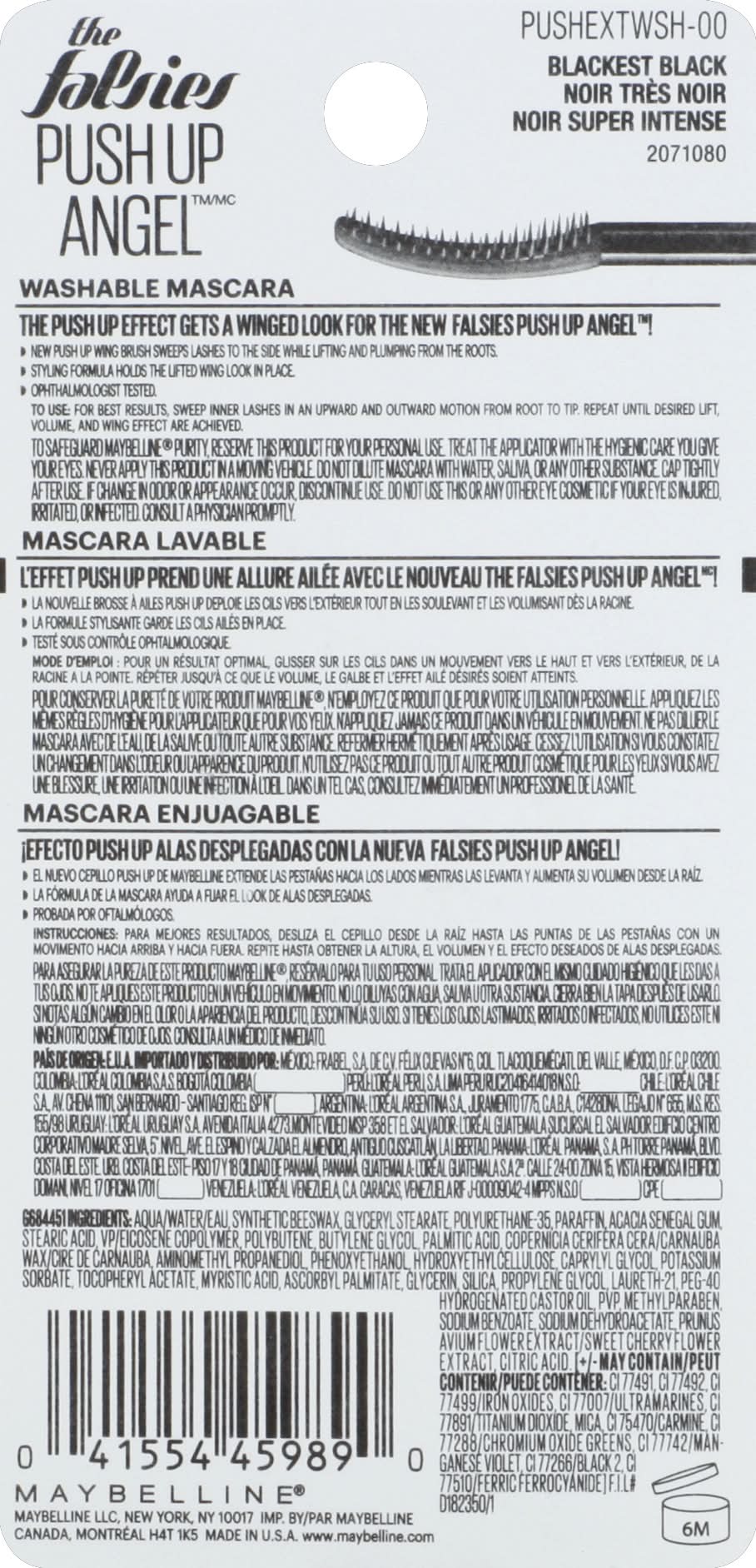 Pushed up lashes winged look. Push up wing brush. New. Washable Mascara: The push up effect gets a winged look for the new Falsies Push Up Angel! New push up wing brush sweeps lashes to the side while lifting and plumping from the roots. Styling formulas holds the lifted wing look in place. Ophthalmologist tested. www.maybelline.com. Made in USA. • Size: 1 CT • Maybelline New York, New York, NY 10017