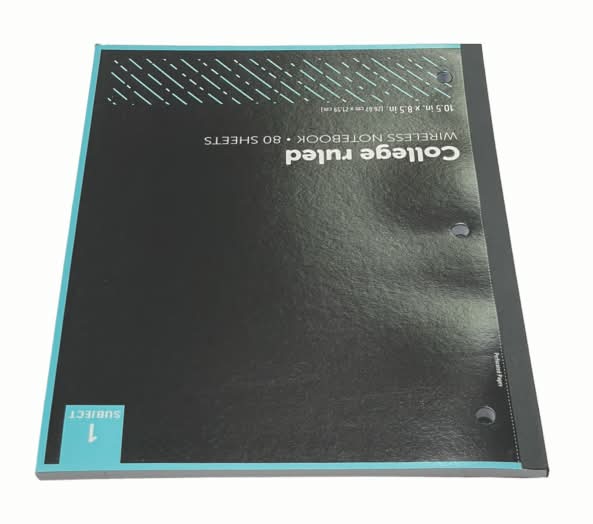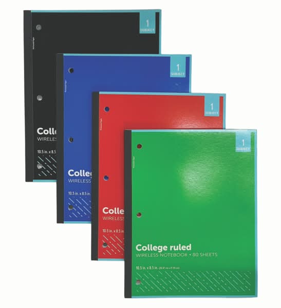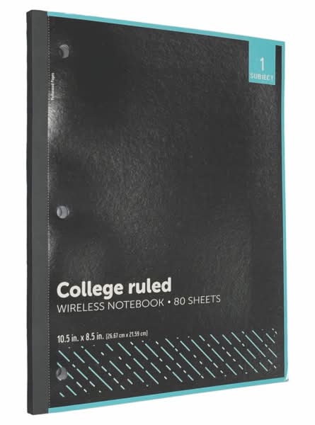 Designed for versatility, the Meijer 1 Subject College Rule Wireless Notebook is suitable for school, home, or office use. It features a durable front cover and a strong back cover that help maintain the smoothness and cleanliness of its pages. For convenience, each page is perforated, allowing for easy detachment, and is also 3-hole punched to facilitate easy insertion into binders. The notebook contains double-sided college-ruled pages and is available in a variety of colors including red, blue, green, and black.