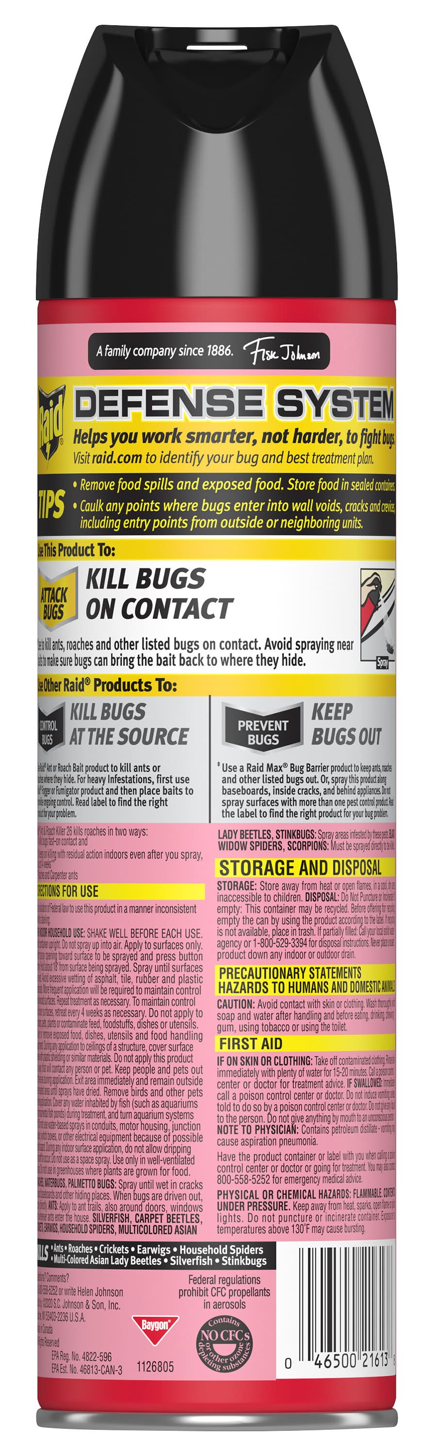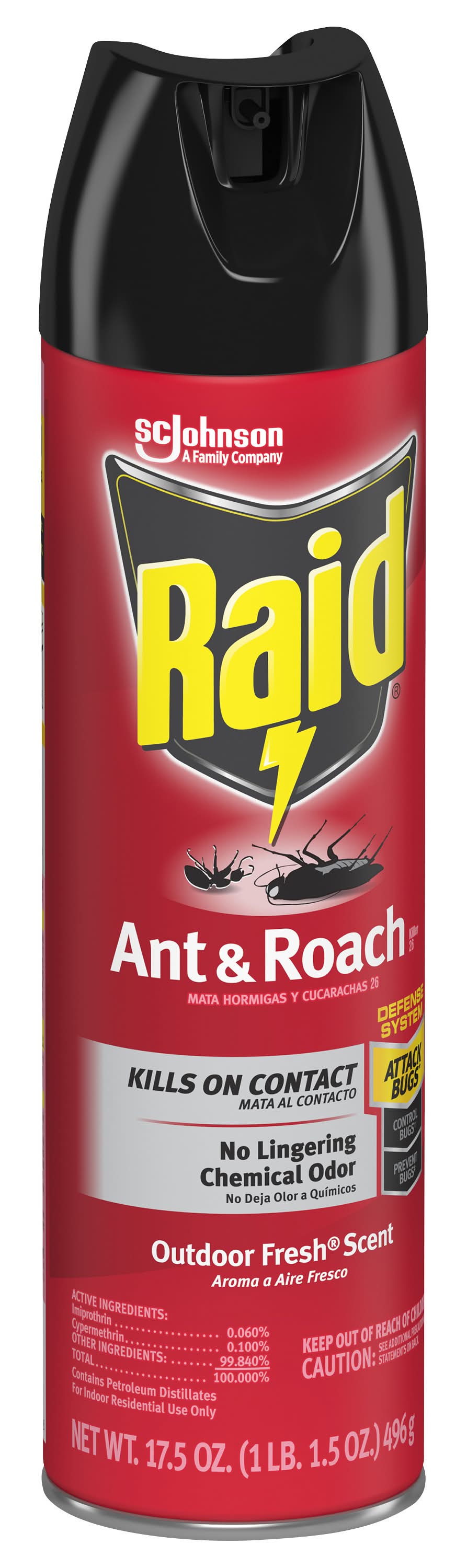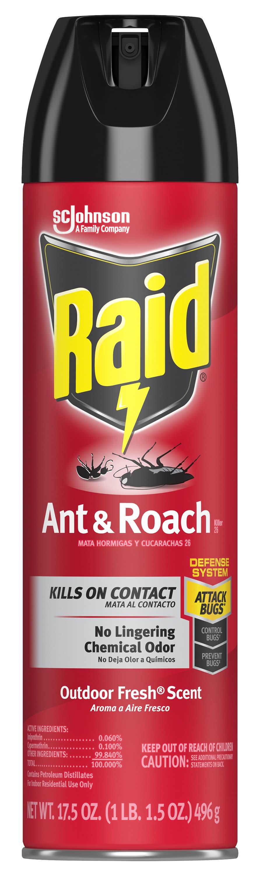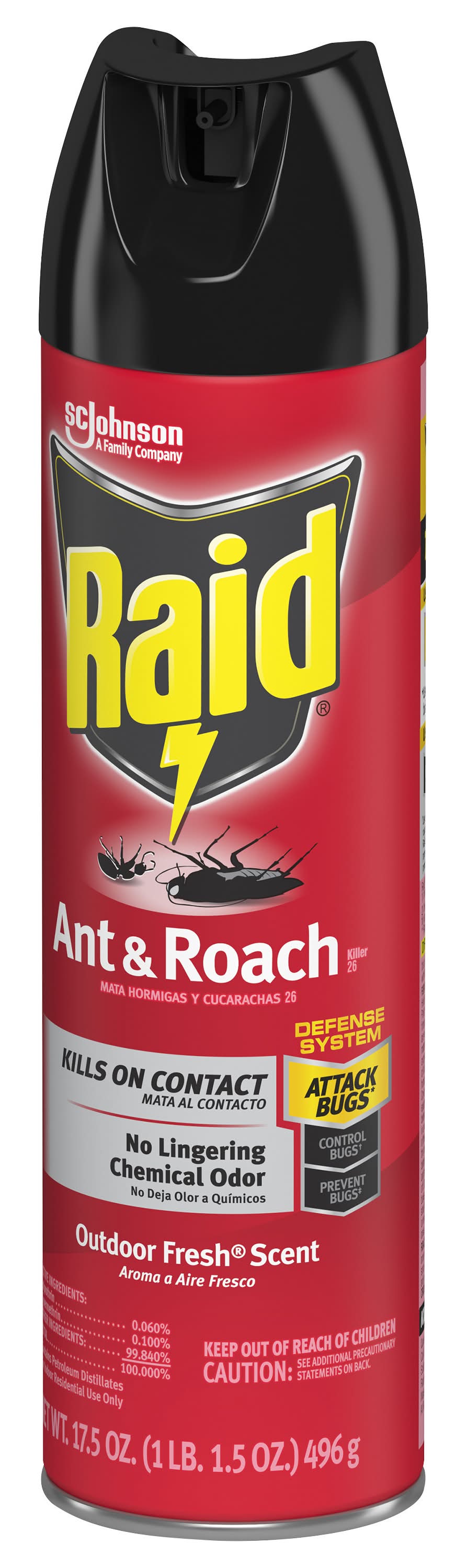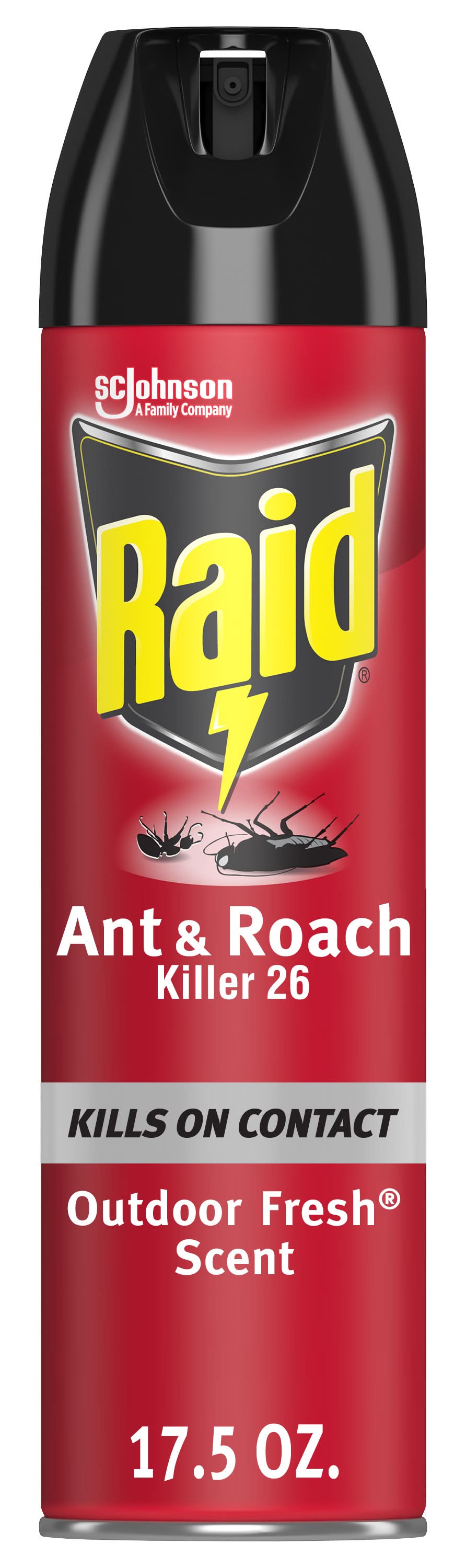 Kills on contact! A family company. No lingering chemical odor. A family company since 1886. - Fisk Johnson. Raid Ant & Roach Killer 17 kills roaches in two ways: 1) It kills bugs fast- on contact and 2) It keeps on killing with residual action even after you spray, for up to 4 weeks. • Size: 17.5 OZ • SC Johnson & Son, Inc., Racine,WI,53403-2236