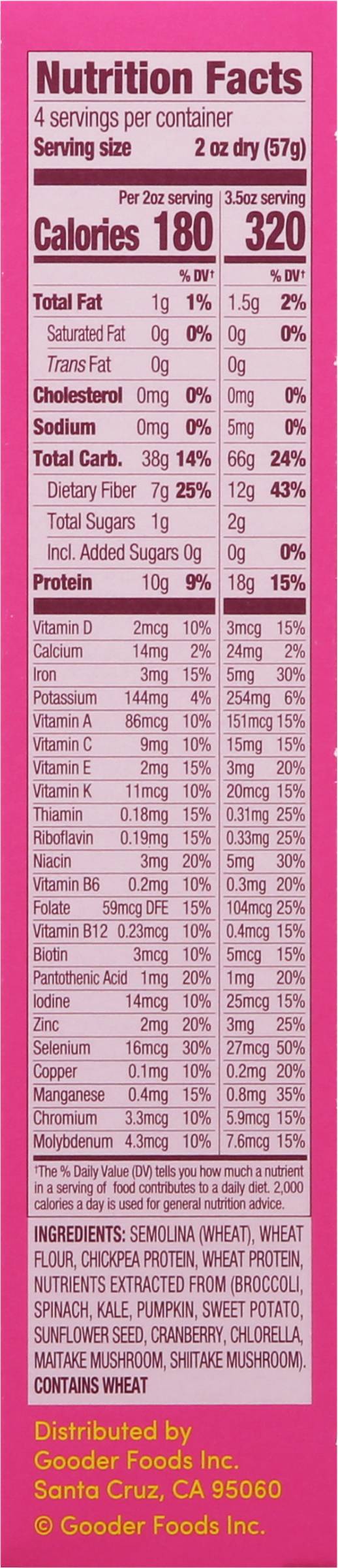 Ingredients: Semolina (Wheat), Wheat Flour, Chickpea Protein, Wheat Protein, Nutrients Extracted from (Broccoli Spinach Kale Pumpkin Sweet Potato Sunflower Seed Cranberry Chlorella Maitake Mushroom Shiitake Mushroom) Contains: Wheat