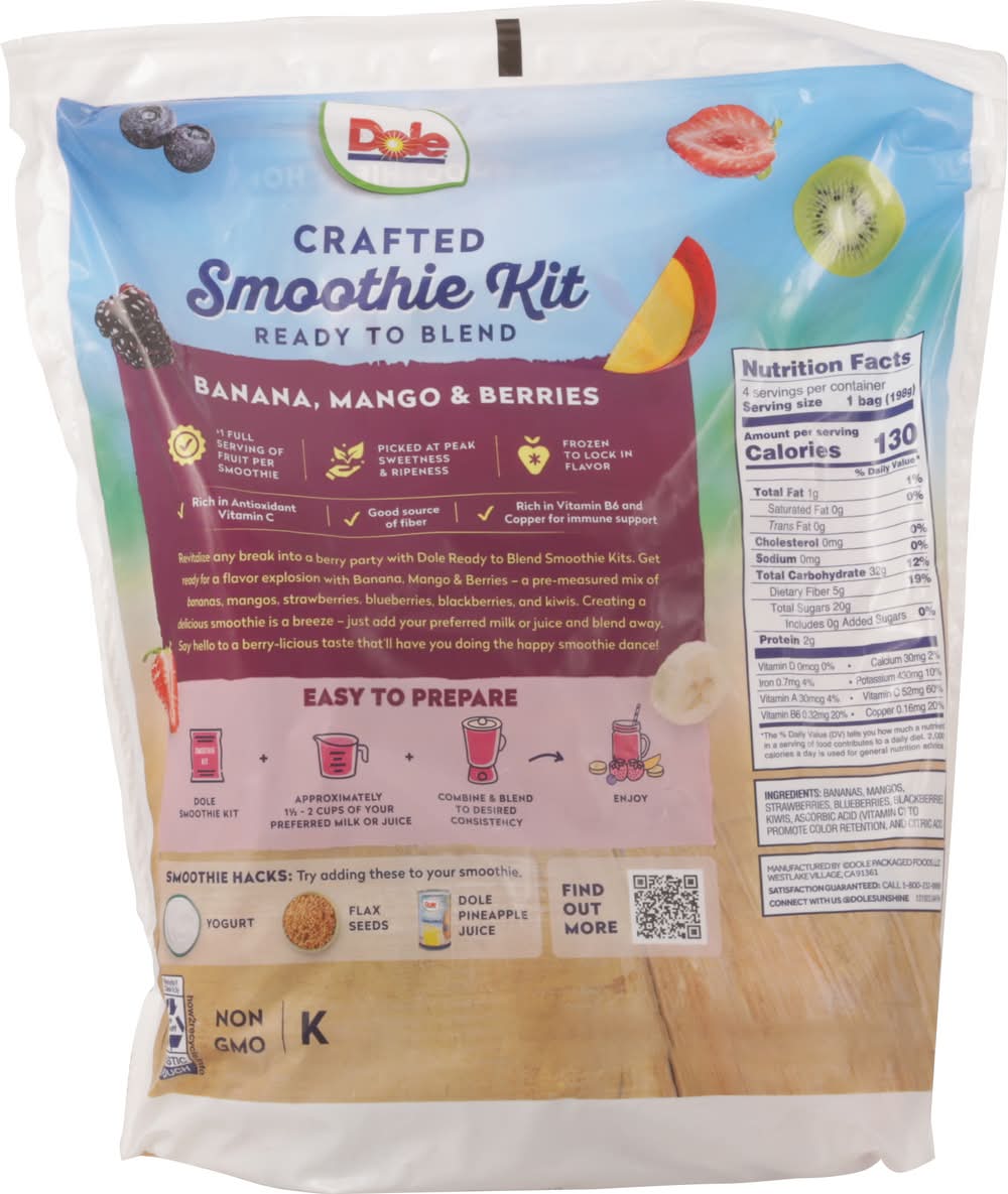 Directions for use: Easy to Prepare: Dole Smoothie Kit + Approximately 1-1/2 - 2 cups of your preferred milk or juice + Combine & blend to desired consistency. Enjoy. Smoothie Hacks: Try adding these to your smoothie. Yogurt; Flax Seeds; Dole Pineapple Juice. Keep frozen. Storage recommendation: Keep frozen.