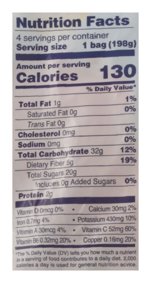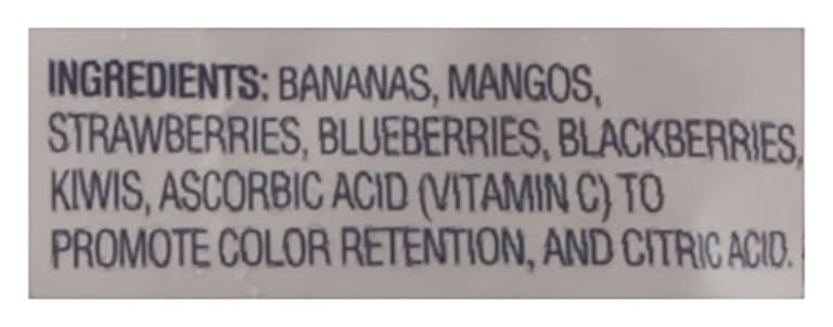 Ingredients: Bananas, Mangos, Strawberries, Blueberries, Blackberries, Kiwis, Ascorbic Acid (Vitamin C) to Promote Color Retention, and Citric Acid