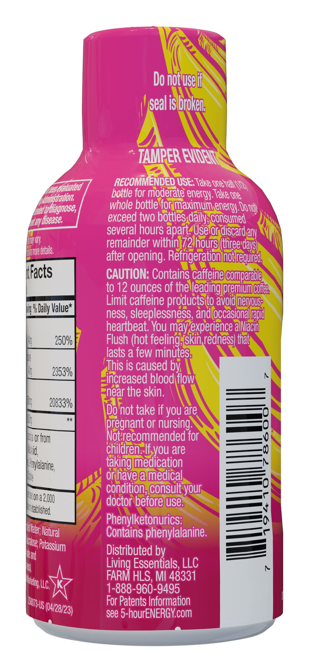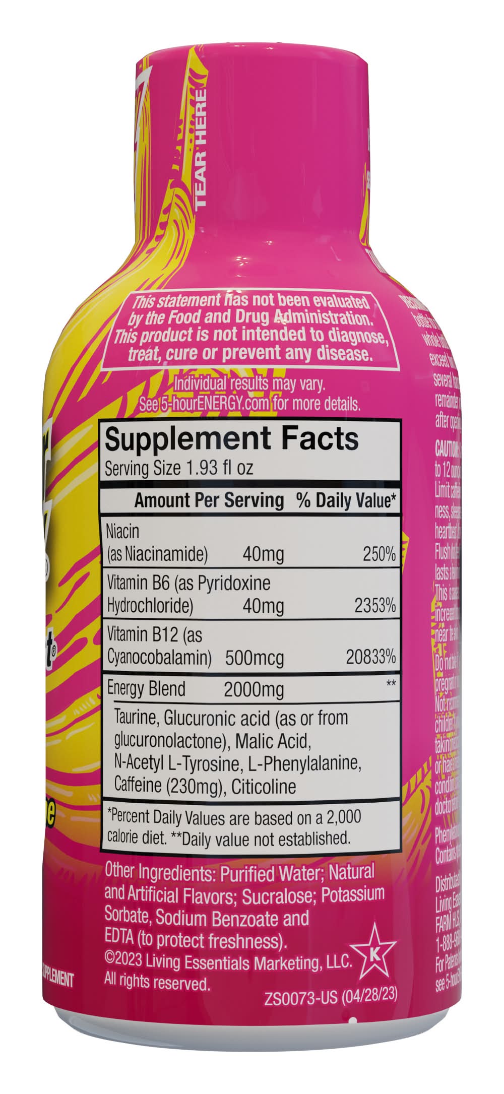 5-Hour Energy Extra Strength Energy Drink is a sugar-free dietary supplement designed to provide an increase in energy and alertness. Each 1.93 fl oz serving contains 4 calories and includes vitamins and nutrients along with caffeine. The effectiveness of this product can vary from person to person. It is not intended to diagnose, treat, cure, or prevent any disease, as this claim has not been evaluated by the Food and Drug Administration. Living Essentials, Farm Hls , MI , 48331