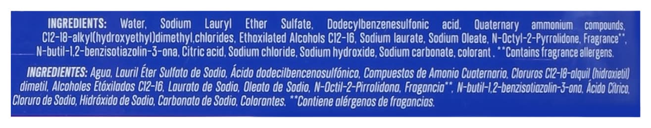 Water, Sodium Lauryl Ether Sulfate, Dodecylbenzenesulfonic Acid, Quaternary Ammonium Compounds, C12-18-Alkyl (Hydroxyethyl) Dimethyl Chlorides, Ethoxilated Alcohols C12-16, Sodium Laurate, Sodium Oleate, N-Octyl-2-Pyrrolidone, Fragrance (Contains Fragrance Allergens), N-Butil-1.2-Benzisotiazolin-3-Ona, Citric Acid, Sodium Chloride, Sodium Hydroxide, Sodium Carbonate, Colorant