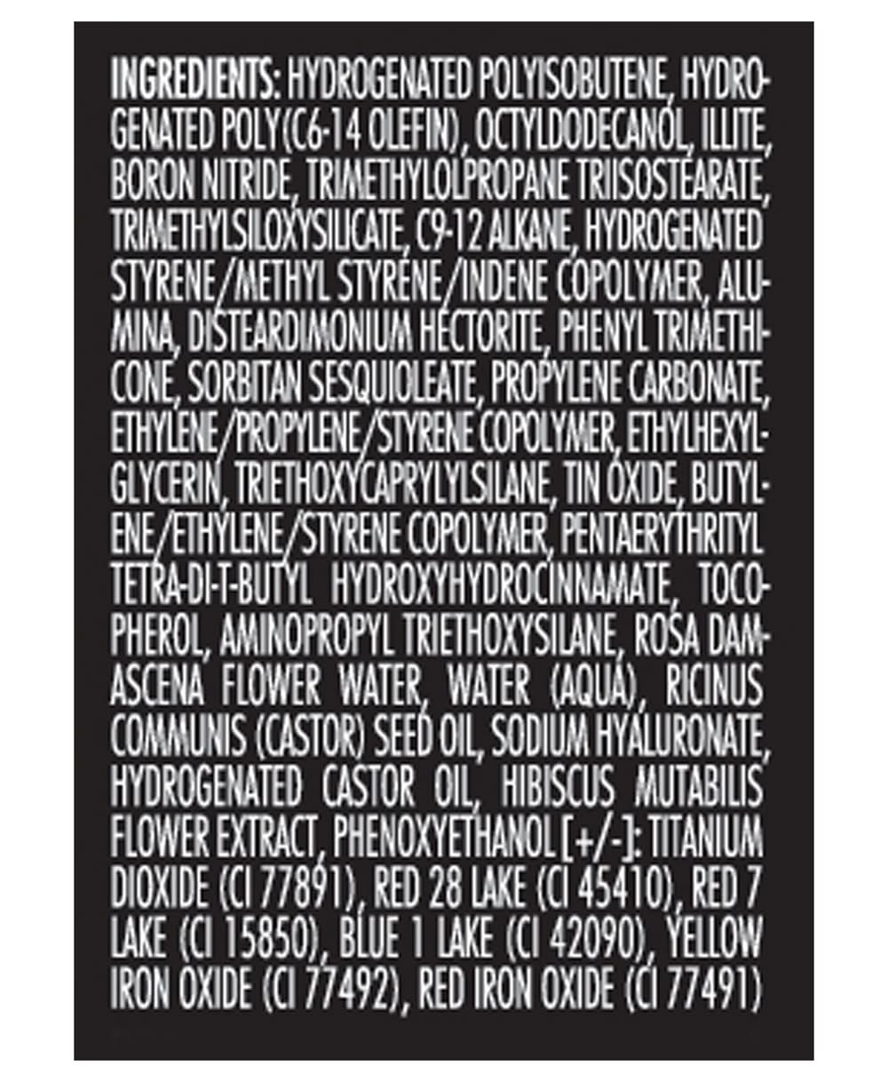 Ingredients: Hydrogenated Polyisobutene, Hydrogenated Poly(C6-14 Olefin), Octyldodecanól, Illite, Boron Nitride, Trimethylolpropane Triisostearate, Trimethylsiloxysilicate, C9-12 Alkane, Hydrogenated Styrene/Methyl Styrene/Indene Copolymer, Alumina, Disteardimonium Hectorite, Phenyl Trimethicone, Sorbitan Sesquioleate, Propylene Carbonate, Ethylene/Propylene/Styrene Copolymer, Ethylhexylglycerin, Triethoxycaprylylsilane, Tin Oxide, Butylene/Ethylene/Styrene Copolymer, Pentaerythrityl Tetra-Di-T-Butyl Hydroxyhydrocinnamate, Tocopherol, Aminopropyl Triethoxysilane, Rosa Damascena Flower Water, Water (Aqua), Ricinus Communis (Castor) Seed Oil, Sodium Hyaluronate, Hydrogenated Castor Oil, Hibiscus Mutabilis Flower Extract, Phenoxyethanol [+/-]: Titanium Dioxide (CI 77891), Red 28 Lake (CI 45410), Red 7 Lake (CI 15850), Blue 1 Lake (CI 42090), Yellow Iron Oxide (CI 77492), Red Iron Oxide (CI 77491)