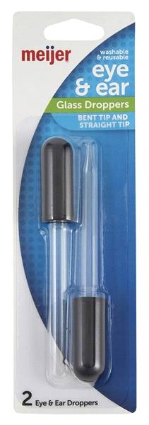 Meijer Eye & Ear Glass Droppers come as a pack featuring two distinct styles: one dropper with a bent tip and another with a straight tip. Both droppers are designed to be washable and reusable, making them a practical choice for various eye and ear drop applications.