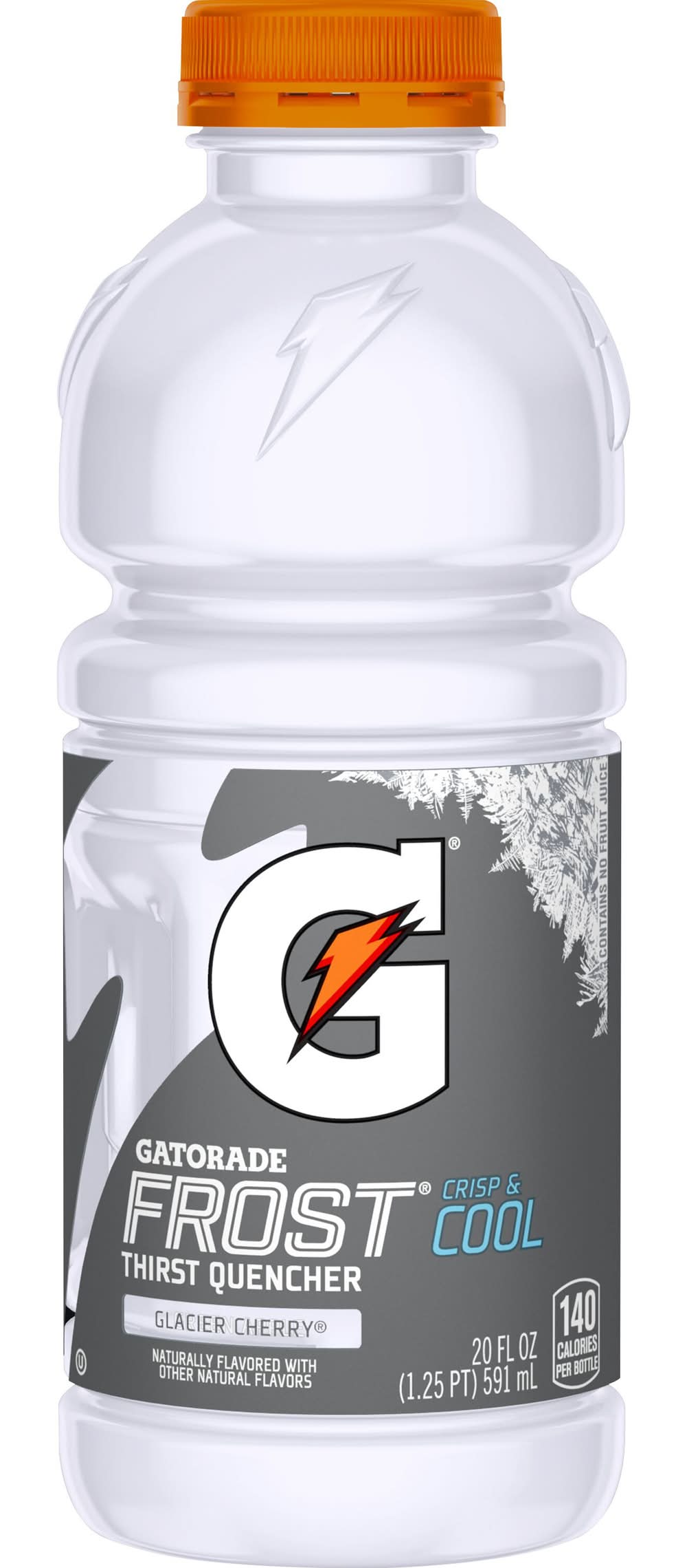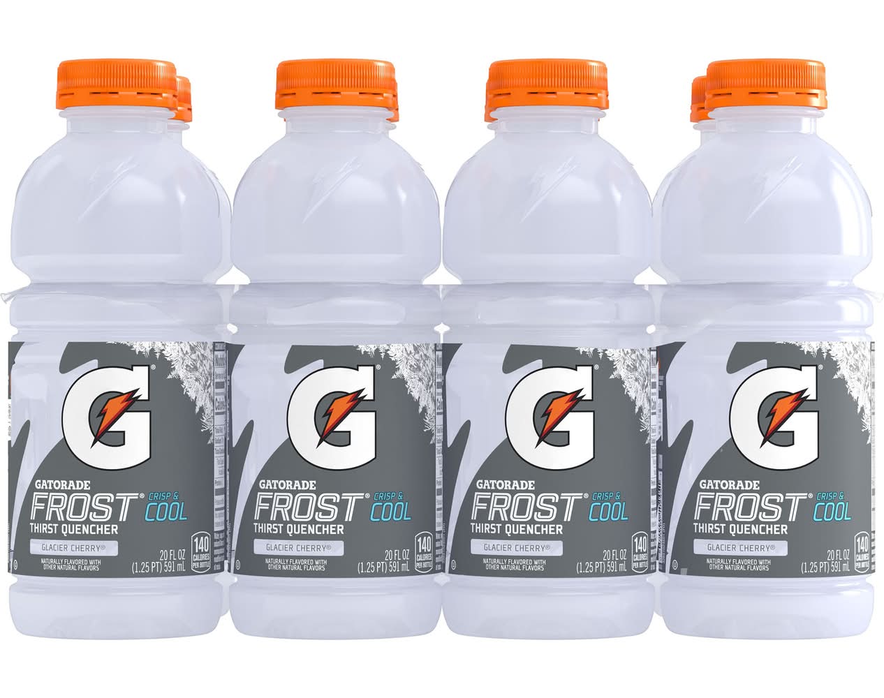 Frost Glacier Cherry Thirst Quencher offers hydration with a refreshing cherry flavor. Each pack contains eight 20 fluid ounce bottles, formulated to help replenish electrolytes. • Flavor: Glacier cherry • Pack size: 8 • The Gatorade Co., PO Box 049003,Chicago,IL,60604