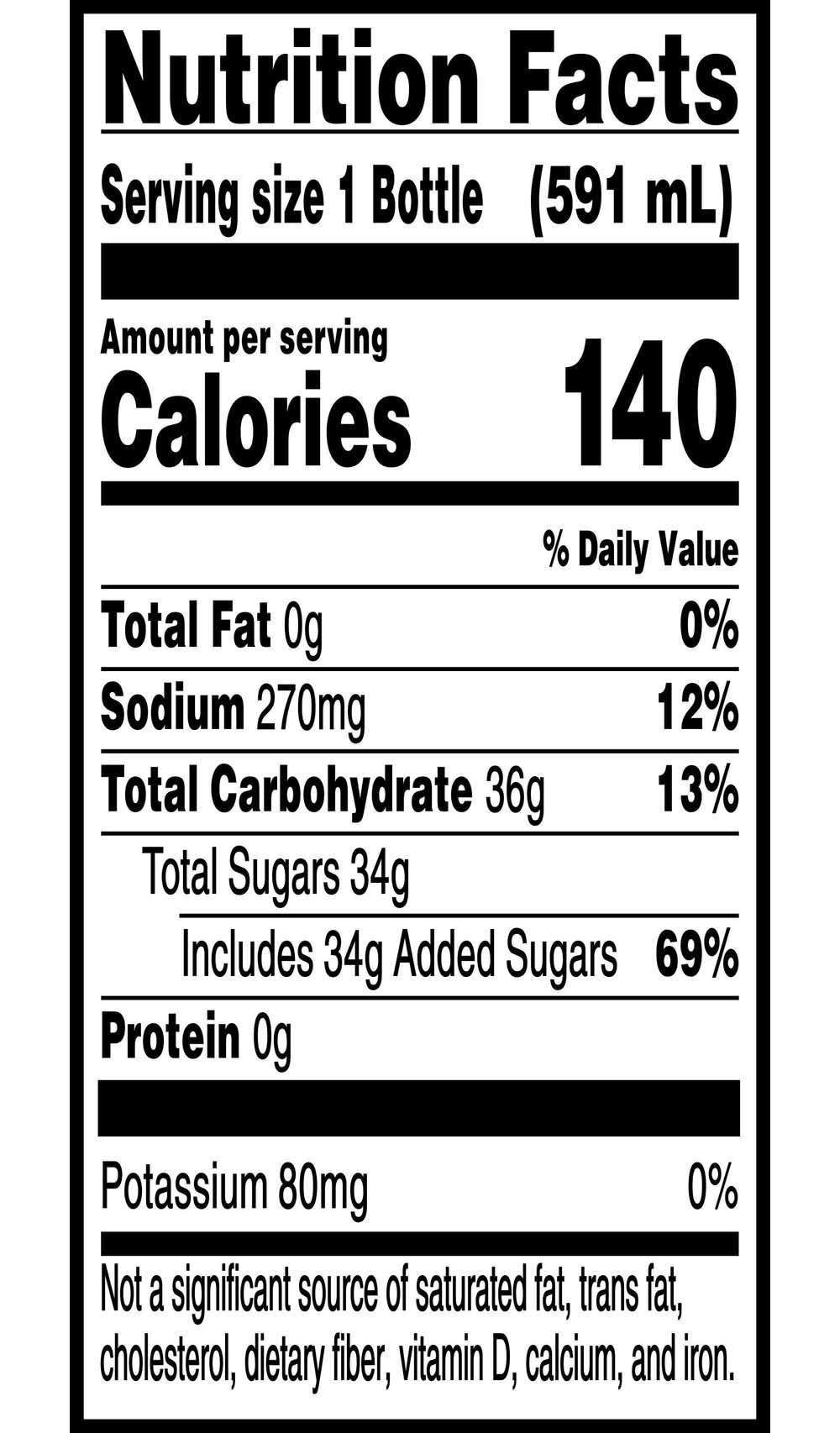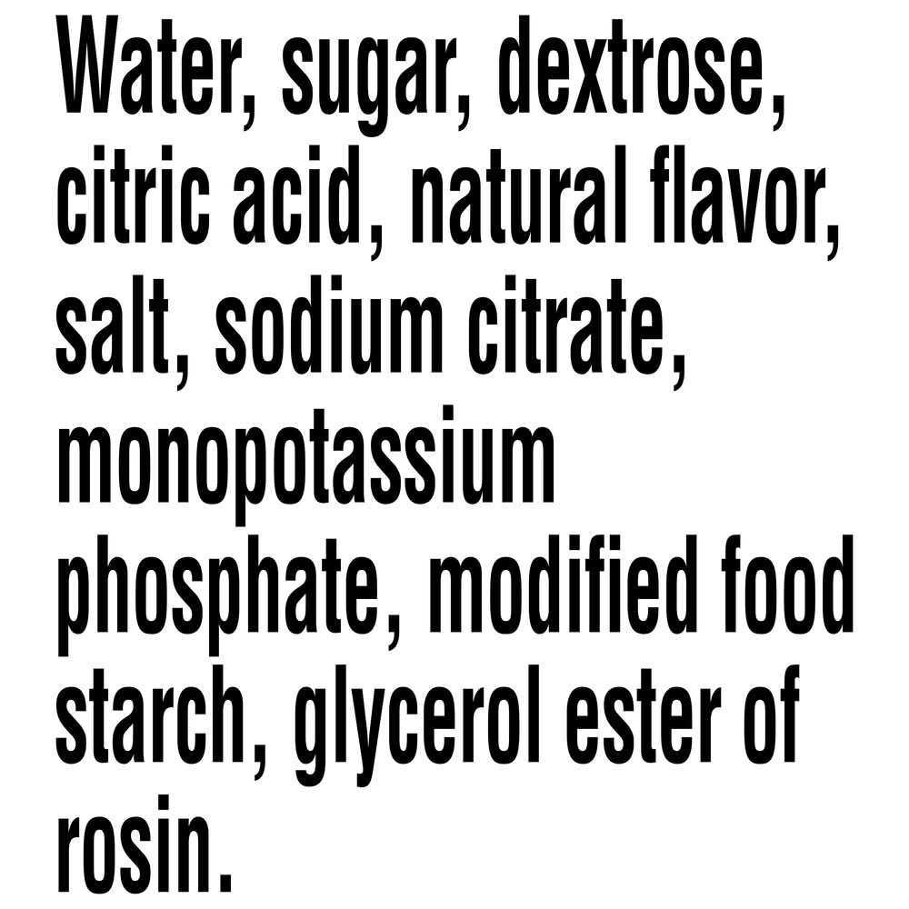 Ingredients: Water, Sugar, Dextrose, Citric Acid, Natural Flavor, Salt, Sodium Citrate, Monopotassium Phosphate, Modified Food Starch, Glycerol Ester Of Rosin.