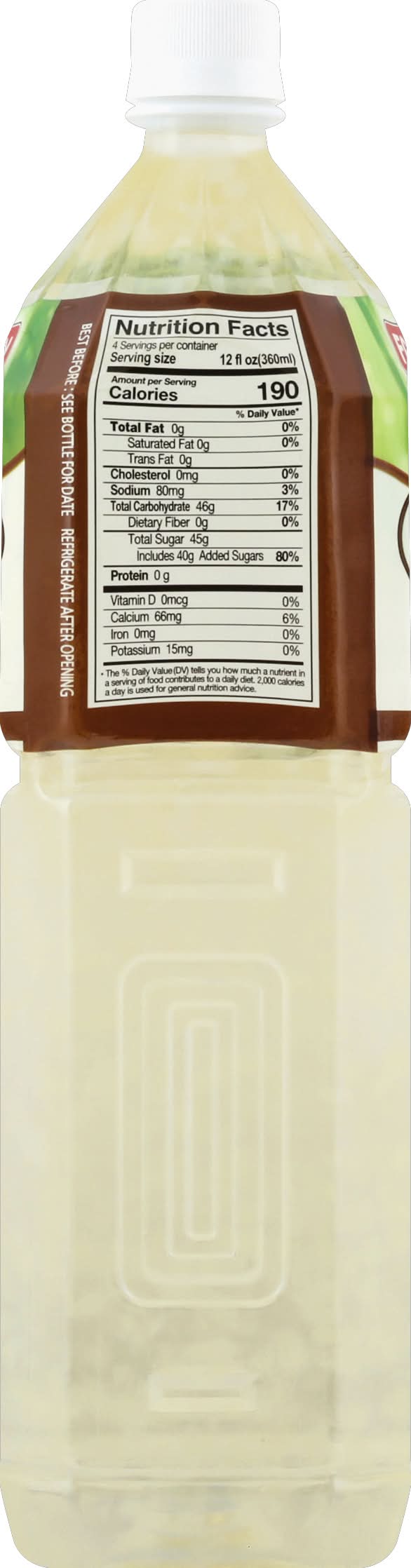 Purified Water, Fructose, Nata De Coco, Artificial Coconut Flavor, Calcium Lactate, Citric Acid, Trisodium Citrate, Gellan Gum, Aloe Vera Gel Powder, Vitamin C Contains: Tree Nuts