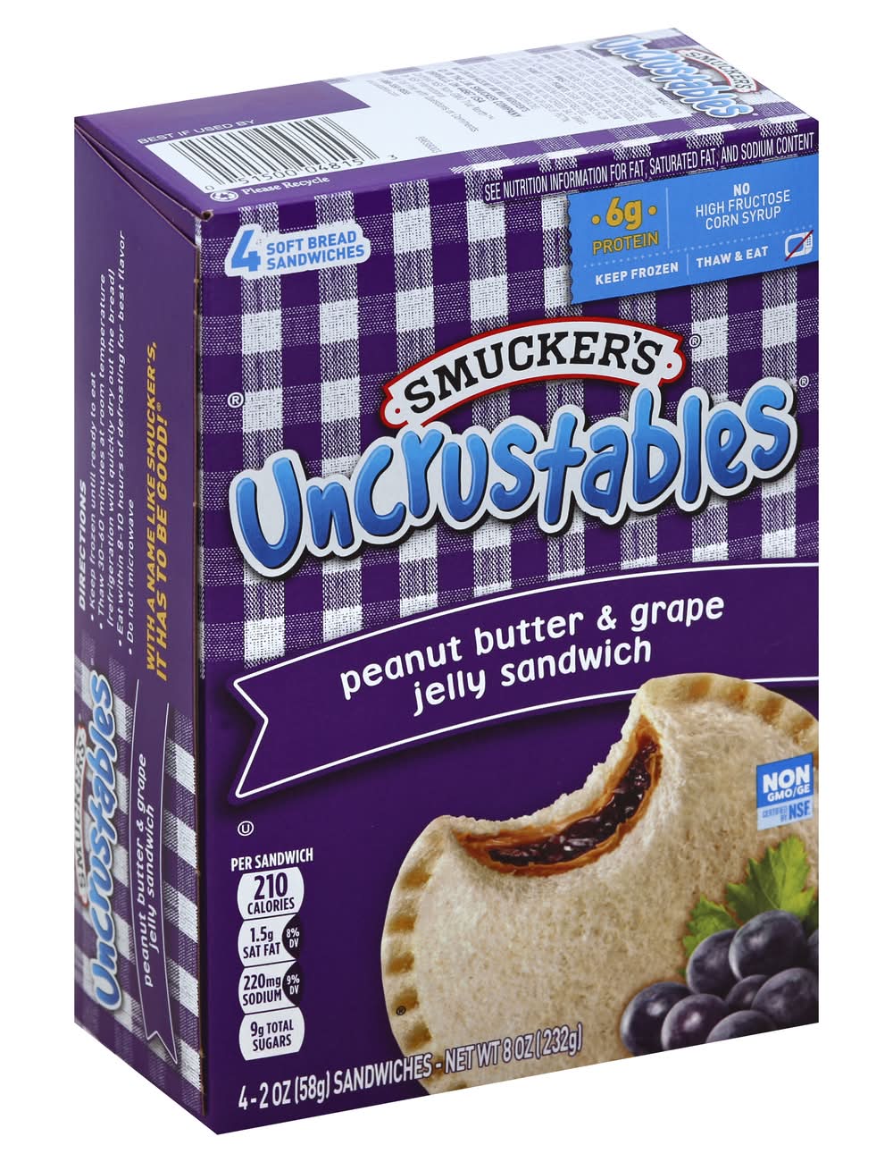 Uncrustables Sandwich, Peanut Butter & Grape Jelly • Pack size: 4 • Size: 4 CT • The J.m. Smucker Company, Orrvilla,OH,44667,USA • Packaging: Reusable