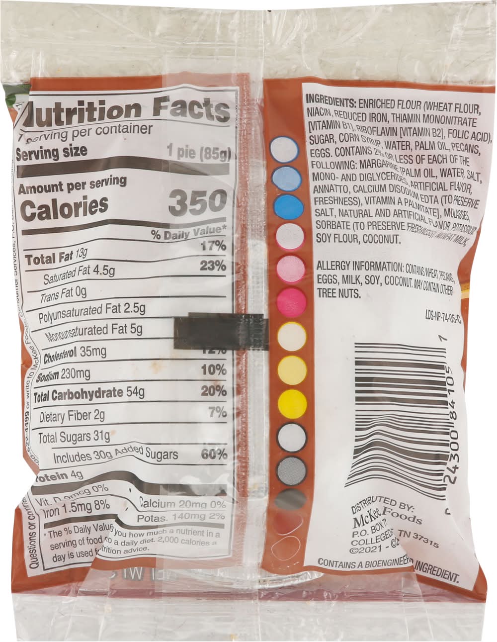 Ingredients: Enriched Flour (Wheat Flour, Niacin, Reduced Iron, Thiamin Mononitrate [Vitamin B1], Riboflavin [Vitamin B2], Folic Acid), Sugar, Corn Syrup, Water, Palm Oil, Pecans, Eggs, Contains 2% or Less of Each of the Following: Margarine [Palm Oil, Water, Salt, Mono- and Diglycerides, Artificial Flavor, Annatto, Calcium Disodium EDTA (to Preserve Freshness), Vitamin A Palmitate], Molasses, Salt, Natural and Artificial Flavor, Potassium Sorbate (to Preserve Freshness), Nonfat Milk, Soy Flour, Coconut Contains: Wheat, Tree Nuts, Pecans, Eggs, Milk, Soybeans, Tree Nuts, Coconuts, Corn, Tree Nuts