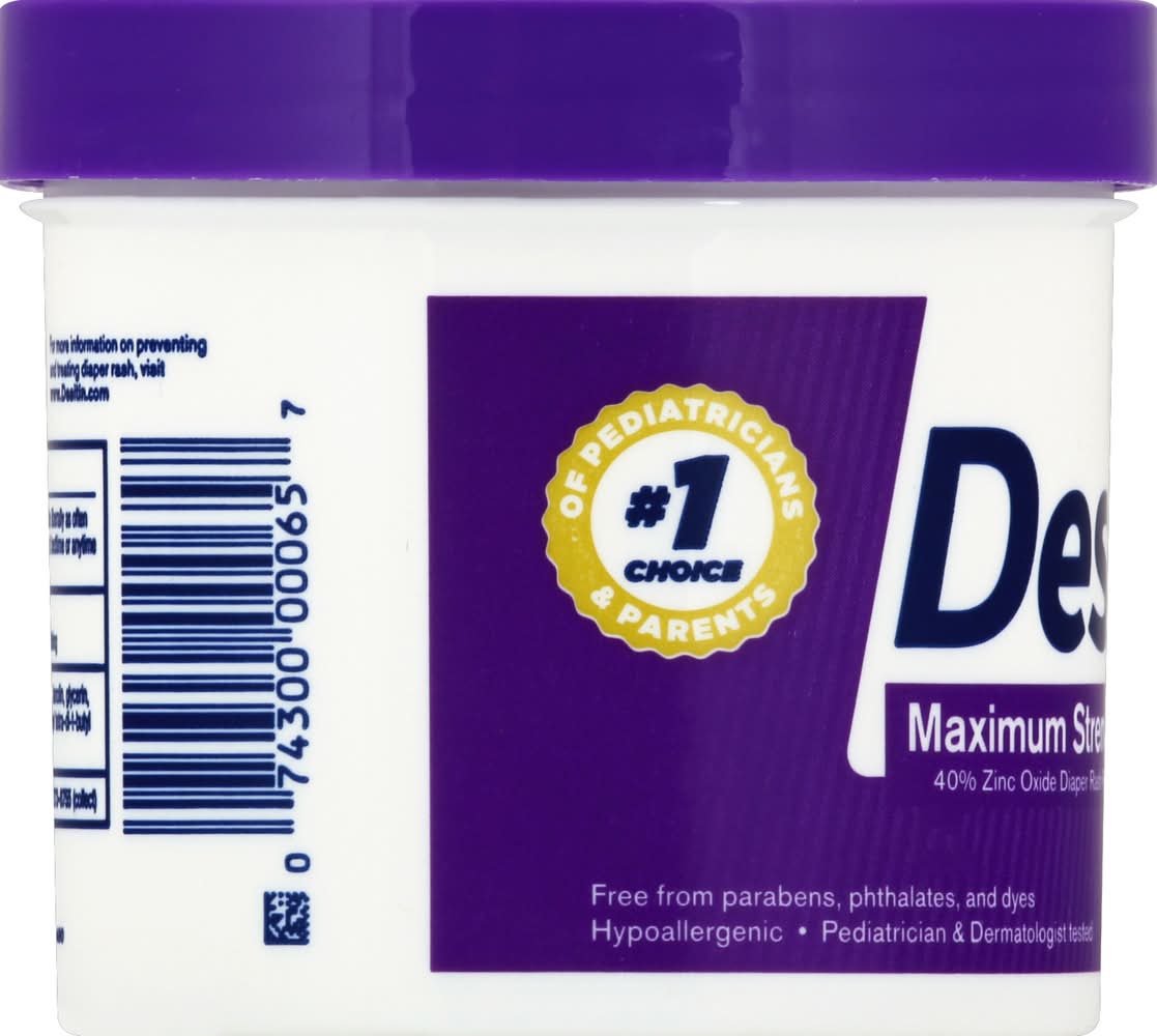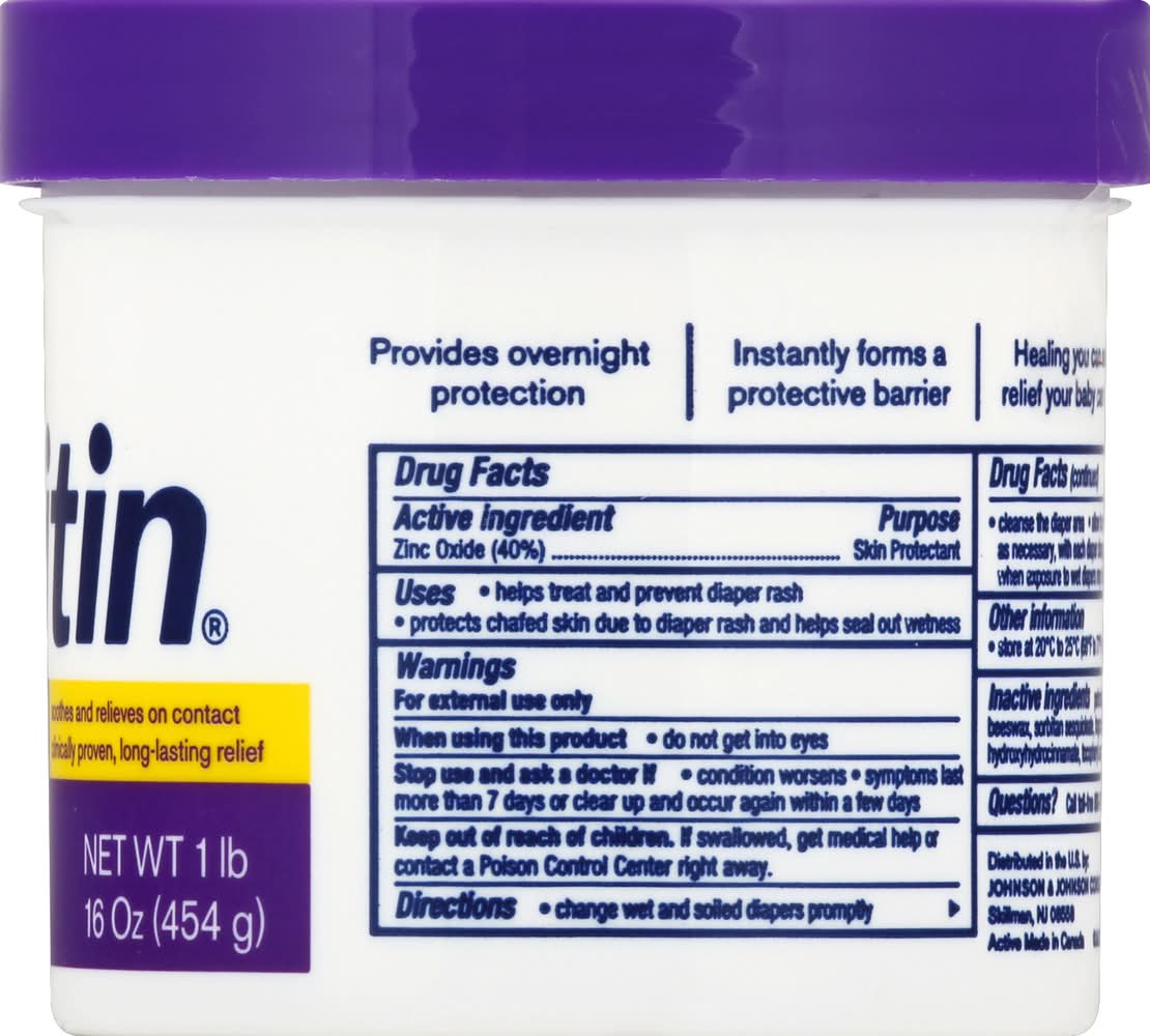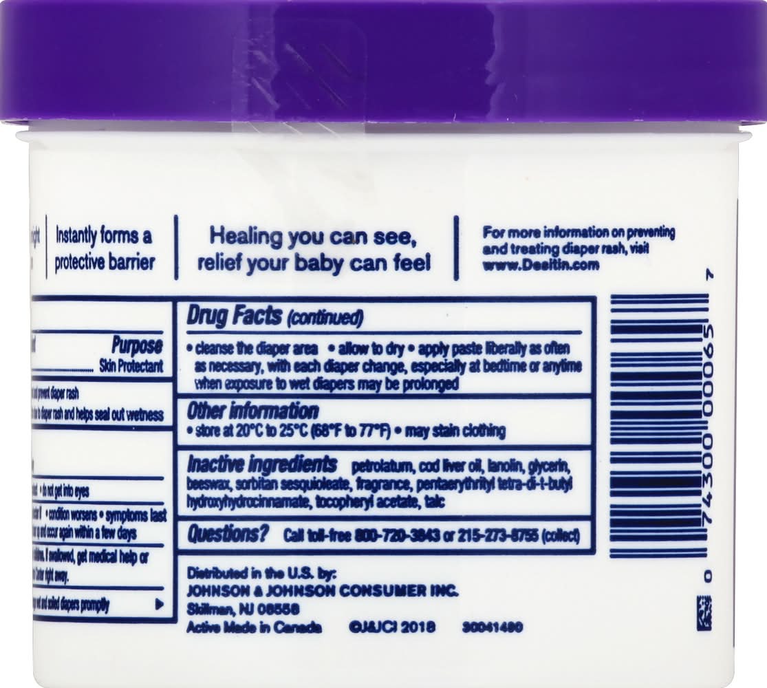 Other Information: Store at 68 degrees F to 77 degrees F (20 degrees C to 25 degrees C). May stain clothing. Misc: Zinc Oxide (40%). Soothes and relieves on contact clinically proven, long-lasting relief. Free from parabens, phthalates, and dyes. Hypoallergenic. Pediatrician & dermatologist tested. No. 1 choice of pediatricians & parents. Provides overnight protection. Instantly forms a protective barrier. Healing you can see, relief your baby can feel. For more information on preventing and treating diaper rash, visit www.Desitin.com. Questions? Call toll free 800-720-3843 or 215-273-8755 (collect). Active made in Canada. • Johnson & Johnson Consumer Inc., Sman, NU 08558 • Packaging: Reusable