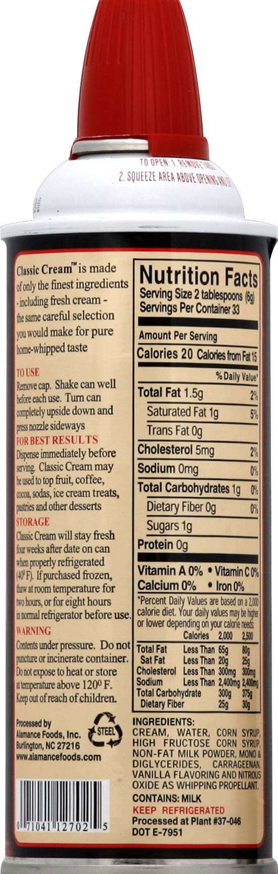 Remove cap. shake can well before each use. turn can completely upside down and press nozzle sideways. rinse nozzle after each use. dispense immediately before serving. classic cream may be used to top fruit, coffee, cocoa, sodas, ice cream treats, pastries and other desserts. classic cream will stay fresh four weeks after date on can when properly refrigerated (40 degrees f). if purchased frozen, thaw for eight hours in normal refrigerator before use.