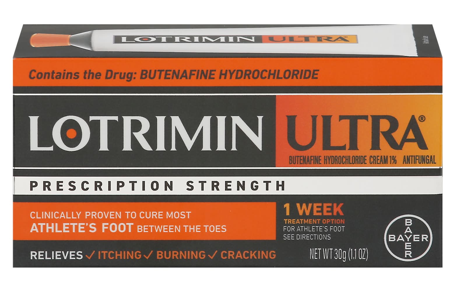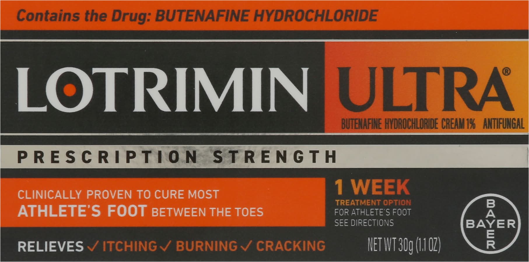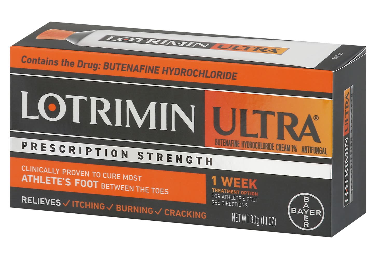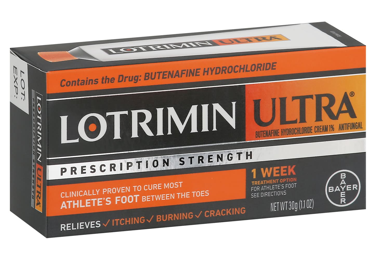 Get relief from the itching, burning, cracking, scaling pain of athlete's foot with Lotrimin Ultra Athlete's Foot Cream. The active ingredient in Lotrimin Ultra Athlete's Foot Cream, butenafine hydrochloride, is clinically proven to cure most athlete's foot between the toes in one week if used as directed. Lotrimin Ultra relieves itchy, cracked feet and toes with this easy-to-apply, prescription strength formula for athletes and other active people. Fight fungus with the power of Lotrimin Ultra - your tinea pedis is no match for this treatment taking care of the fungus that causes most athlete’s foot in just 1 week. Lotrimin Ultra Athlete's Foot Cream can also be used on your body to treat jock itch and ringworm. Packaging: Reusable