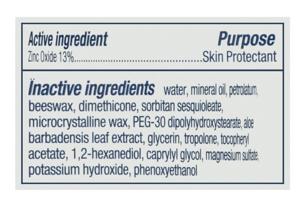 Ingredients: Active Ingredients: Zinc Oxide (13 %), Skin Protectant . Inactive Ingredients: Water, Mineral Oil, Petrolatum, Beeswax, Dimethicone, Sorbitan Sesquioleate, Microcrystalline Wax, PEG-30 Dipolyhydroxystearate, Aloe Barbadensis Leaf Extract, Glycerin, Tropolone, Tocopheryl Acetate, 1, 2-Hexanediol, Caprylyl Glycol, Magnesium Sulfate, Potassium Hydroxide, Phenoxyethanol