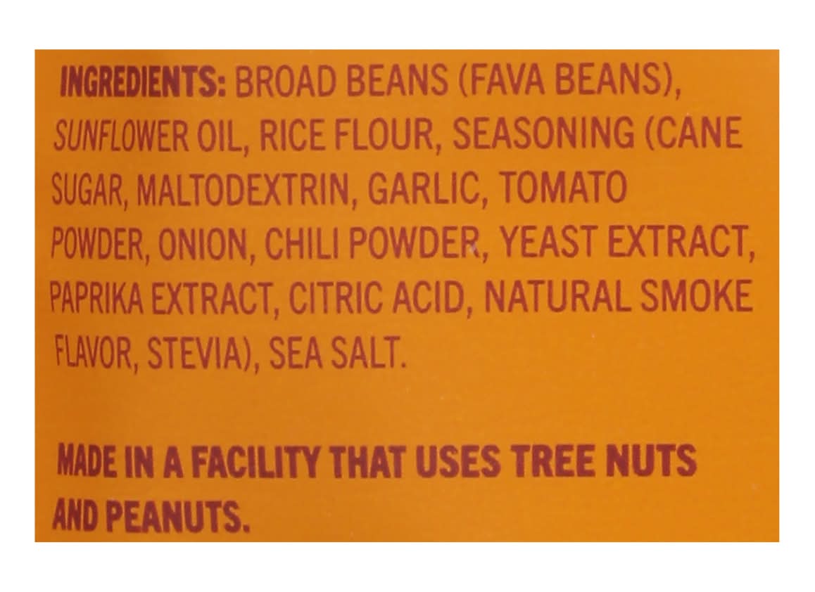 Broad Beans (Fava Beans), Sunflower Oil, Rice Flour, Seasoning (Cane Sugar, Maltodextrin, Garlic, Tomato Powder, Onion, Chili Powder, Yeast Extract, Paprika Extract, Citric Acid, Natural Smoke Flavor, Stevia), Sea Salt Contains: Peanuts, Tree Nuts Additives: None