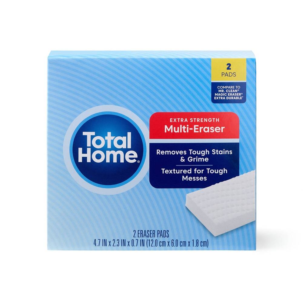Smart buys for every home™ At Total Home®, we know your home and family deserve the best. Our full range of hardworking products deliver great performance and a smart value. Textured For Tough MessesTotal Home® Extra Strength Cleaning eraser is highly effective at cleaning scuffs, stains, and grime from walls, floors, doors, and more. No Chemicals, fumes, or buckets required.> Size: 4.7 in X 2.3 in X 0.7 in