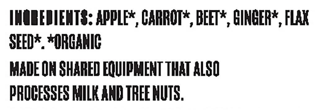 Apple*, Carrot*, Beet*, Ginger*, Flax Seed*. * Organic Contains: Milk, Tree Nuts