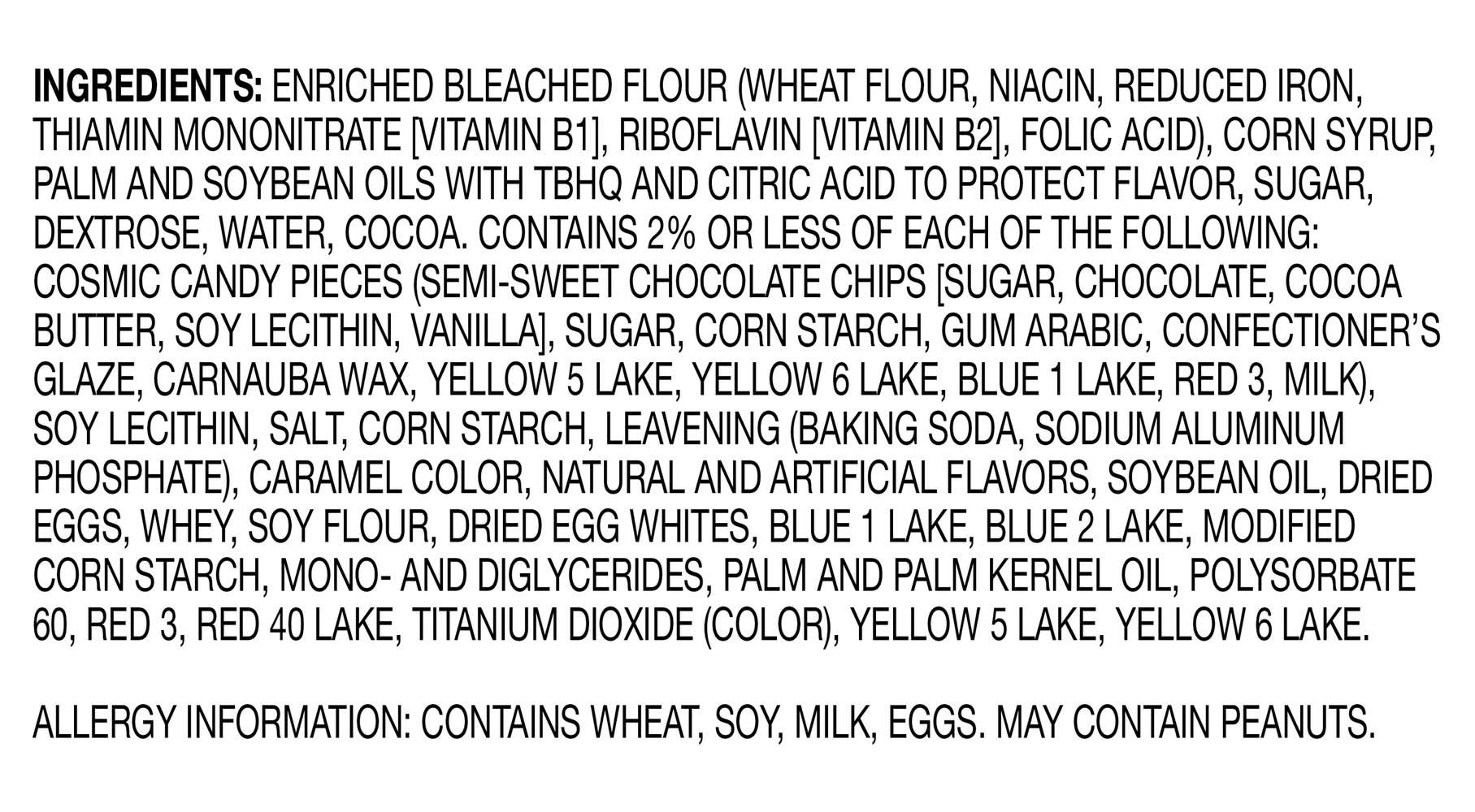 Ingredients: Enriched Bleached Flour (Wheat Flour, Niacin, Reduced Iron, Thiamin Mononitrate [Vitamin B1], Riboflavin [Vitamin B2], Folic Acid), Corn Syrup, Palm and Soybean Oils with TBHQ and Citric Acid to Protect Flavor, Sugar, Dextrose, Water, Cocoa, Contains 2% or Less of Each of the Following: Cosmic Candy Pieces (Semi-Sweet Chocolate Chips [Sugar, Chocolate, Cocoa Butter, Soy Lecithin, Vanilla], Sugar, Corn Starch, Gum Arabic, Confectioner's Glaze, Carnauba Wax, Yellow 5 Lake, Yellow 6 Lake, Blue 1 Lake, Red 3, Milk), Soy Lecithin, Salt, Corn Starch, Leavening (Baking Soda, Sodium Aluminum Phosphate), Caramel Color, Natural and Artificial Flavors, Soybean Oil, Dried Eggs, Whey, Soy Flour, Dried Egg Whites, Blue 1 Lake, Blue 2 Lake, Modified Corn Starch, Mono- and Diglycerides, Palm and Palm Kernel Oil, Polysorbate 60, Red 3, Red 40 Lake, Titanium Dioxide (Color), Yellow 5 Lake, Yellow 6 Lake. Contains: Wheat, Soybeans, Milk, Eggs, Corn, Peanuts Additives: Genetically Modified Ingredients