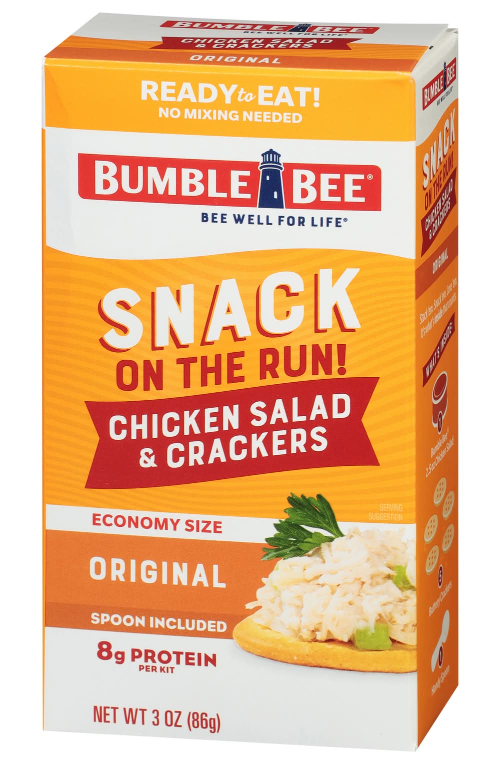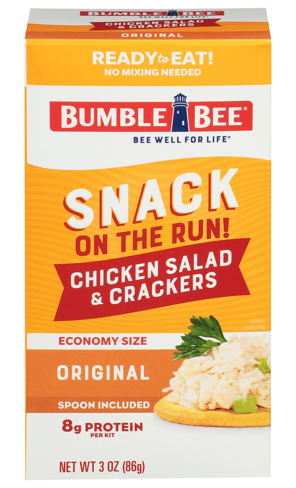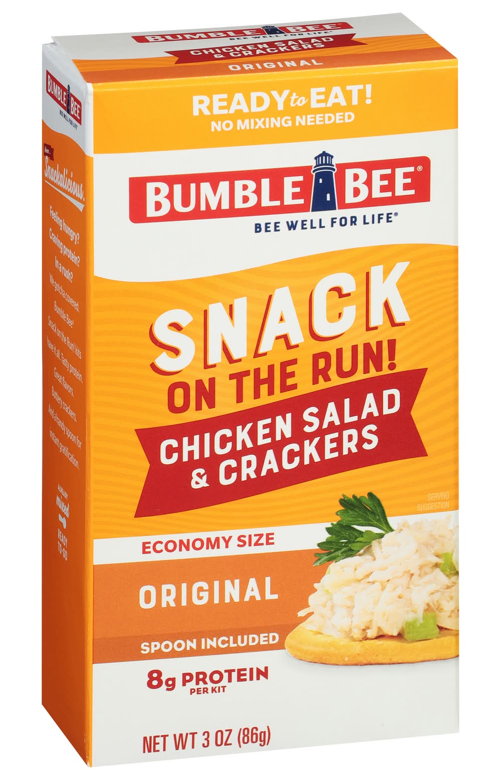 Spoon included. 8 g protein per kit. Ready to eat! No mixing needed. Bee well for life. Spoon included. Mmm - Snackalicious. Feeling hungry? Craving protein? In a rush? We gotcha covered. Bumble Bee Snack on the Run! Kits have it all. Tasty protein. Great flavors. Buttery crackers. And a handy spoon for instant gratification. Already mixed. Ready to-go. Stack ’em. Snack ’em. Love ‘em. It’s what’s inside that counts. What’s Inside: 1 Bumble Bee 2.5 oz Chicken Salad; 5 buttery crackers; 1 handy spoon. bumblebee.com. For inquiries concerning product, include number shown on carton & can end. Assembled in the USA.