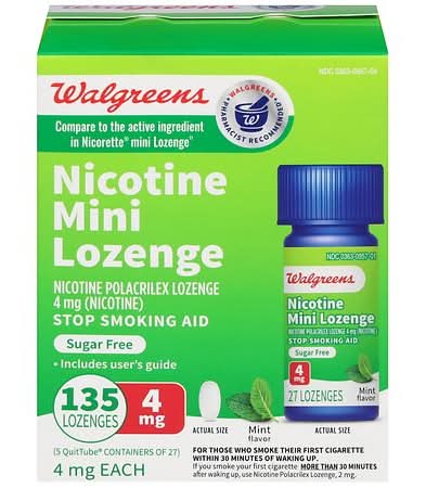 Compare to Nicorette mini Lozenge active ingredient. Double your chance to successfully quit smoking with Walgreens Mini Nicotine Polacrilex Lozenge, 4 mg (when used as directed with a support program. Many people require several quit attempts to stop smoking). Walgreens Mini Nicotine Polacrilex Lozenge, 4 mg (nicotine), Mint Flavor is a stop smoking aid for those who smoke their first cigarette within 30 minutes of waking up. This product is part of a Nicotine Replacement Therapy, which is