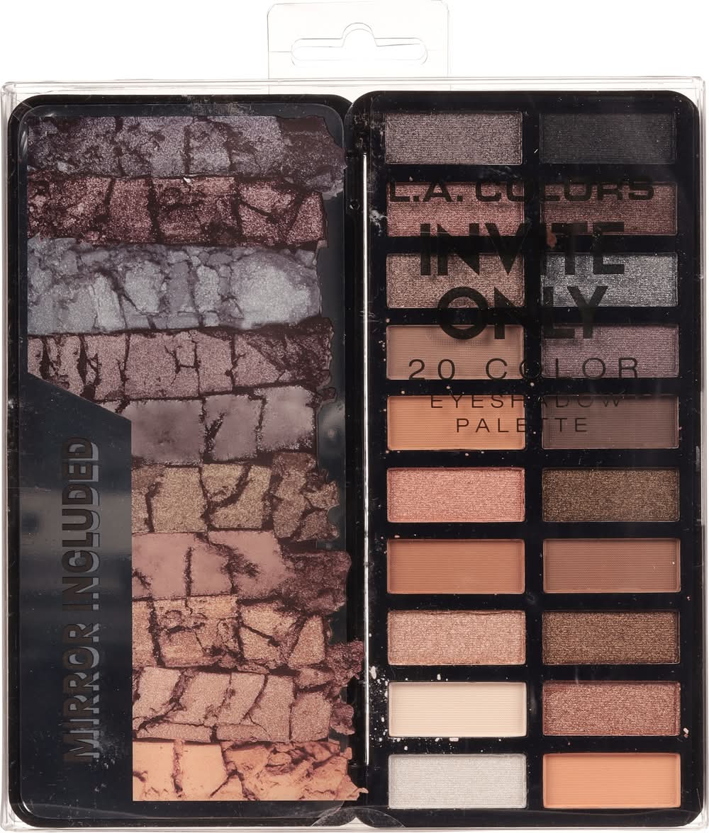 20 colors eyeshadow palette. Mirror included. www.lacolors.com. Designed in USA. Made in China.