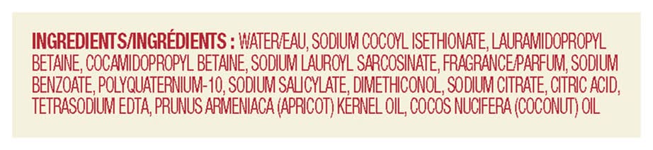 Water/Eau, Sodium Cocoyl Isethionate, Lauramidopropyl Betaine, Cocamidopropyl Betaine, Sodium Lauroyl Sarcosinate, Fragrance/Parfum, Sodium Benzoate, Polyquaternium-10, Sodium Salicylate, Dimethiconol, Sodium Citrate, Citric Acid, Tetrasodium EDTA, Prunus Armeniaca (Apricot) Kernel Oil, Cocos Nucifera (Coconut) Oil