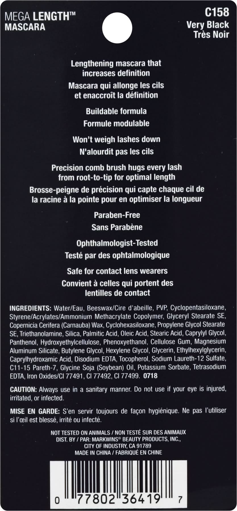 Paraben-free. New look, improved formula. Boosts length. Precision comb brush. Longer-looking lashes. Extends, lifts, & separates. Smudge-proof. Lengthening mascara that increases definition. Buildable formula. Won’t weight lashes down. Precision comb brush hugs every lash from root-to-tip for optimal length. Ophthalmologist-tested. Safe for contact lens wearers. Cruelty free. Not tested on animals. Made in China. • Color: Black • Markwins Beauty Products Inc., City of Industry,CA,91789