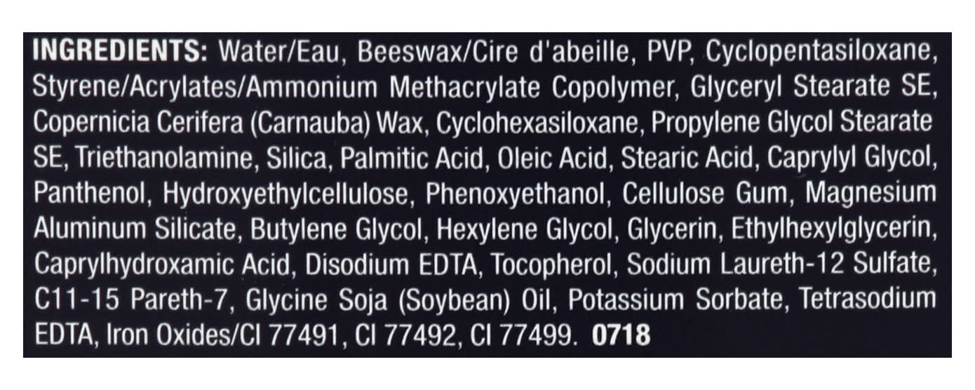 Ingredients: Water/Eau, Beeswax, PVP, Cyclopentasiloxane, Styrene/Acrylates/Ammonium Methacrylate Copolymer, Glyceryl Stearate SE, Copernicia Cerifera (Carnauba) Wax, Cyclohexasiloxane, Propylene Glycol Stearate SE, Triethanolamine, Silica, Palmitic Acid, Oleic Acid, Stearic Acid, Caprylyl Glycol, Panthenol, Hydroxyethylcellulose, Phenoxyethanol, Cellulose Gum, Magnesium Aluminum Silicate, Butylene Glycol, Hexylene Glycol, Glycerin, Ethylhexylglycerin, Caprylhydroxamic Acid, Disodium EDTA, Tocopherol, Sodium Laureth-12 Sulfate, C11-15 Pareth-7, Glycine Soja (Soybean) Oil, Potassium Sorbate, Tetrasodium EDTA, Iron Oxides/CI 77491, CI 77492, CI 77499