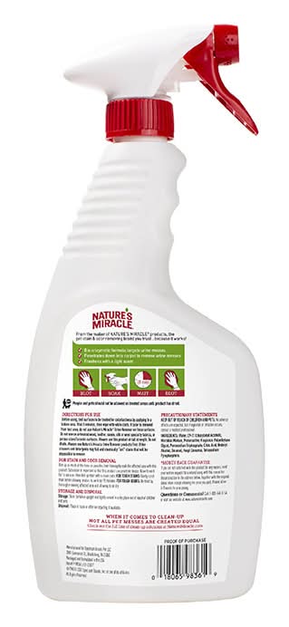 Directions for use: Usage of instructions:Blot. Soak. Wait. Blot. People and pets should not be allowed on treated areas until product has dried. Directions For Use: Before using, test surfaces to be treated for colorfastness by applying to a hidden area. Wait 5 minutes, then wipe with white cloth. If color is removed from test area, do not use Nature's Miracle Urine Remover on those surfaces. Do not use on untreated wood, leather, suede, silk or wool specialty fabrics, or porous stone/ceramic surfaces. Always use this product at full strength. Do not dilute. Always use Nature's Miracle Urine Remover products first. Other cleaners and detergents may fail and chemically set stains that will be impossible to remove. For Stain and Odor Removal: Blot up as much of the mess as possible, then thoroughly soak the affected area with this product. Saturation is important so that this product can penetrate deeply. Allow to work for 15 minutes, then blot up stain with a clean cloth. For Tough Stains: Gently scrub stain before allowing product to work for 15 minutes. For Tough Odors: Re-treat by thoroughly soaking affected area and allowing to air dry. - Directions: Blot. Soak. Wait. Blot. People and pets should not be allowed on treated areas until product has dried. Directions For Use: Before using, test surfaces to be treated for colorfastness by applying to a hidden area. Wait 5 minutes, then wipe with white cloth. If color is removed from test area, do not use Nature's Miracle Urine Remover on those surfaces. Do not use on untreated wood, leather, suede, silk or wool specialty fabrics, or porous stone/ceramic surfaces. Always use this product at full strength. Do not dilute. Always use Nature's Miracle Urine Remover products first. Other cleaners and detergents may fail and chemically set stains that will be impossible to remove. For Stain and Odor Removal: Blot up as much of the mess as possible, then thoroughly soak the affected area with this product. Saturation is important so that this product can penetrate deeply. Allow to work for 15 minutes, then blot up stain with a clean cloth. For Tough Stains: Gently scrub stain before allowing product to work for 15 minutes. For Tough Odors: Re-treat by thoroughly soaking affected area and allowing to air dry. Storage and Disposal: Storage: Store container upright and tightly sealed in a dry place out of reach of children and pets. Disposal: Place in trash or offer for recycling if available. Storage recommendation: Storage and Disposal: Storage: Store container upright and tightly sealed in a dry place out of reach of children and pets. Disposal: Place in trash or offer for recycling if available.