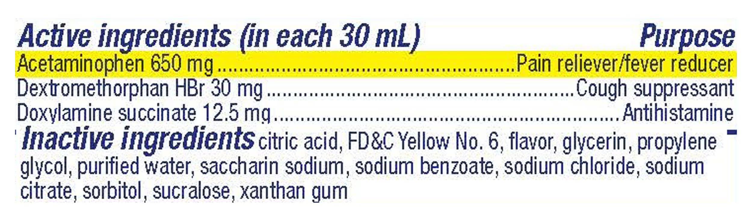 In each 30 ml: directions: take only as directed. only use the dose cup provided. do not exceed 4 doses per 24 hours. adults & children 12 yrs & over: 30 ml every 6 hrs. children 4 to under 12 yrs: ask a doctor. children under 4 yrs: do not use. in each 15 ml: directions: take only as directed. only use the dose cup provided. do not exceed 4 doses per 24 hrs. adults & children 12 yrs & over: 30 ml every 4 hrs. children 6 to under 12 yrs: 15 ml every 4 hrs. children 4 to under 6 yrs: ask a doctor. children under 4 yrs: do not use.parents: learn about teen medicine abuse. www.stopmedicineabuse.org.