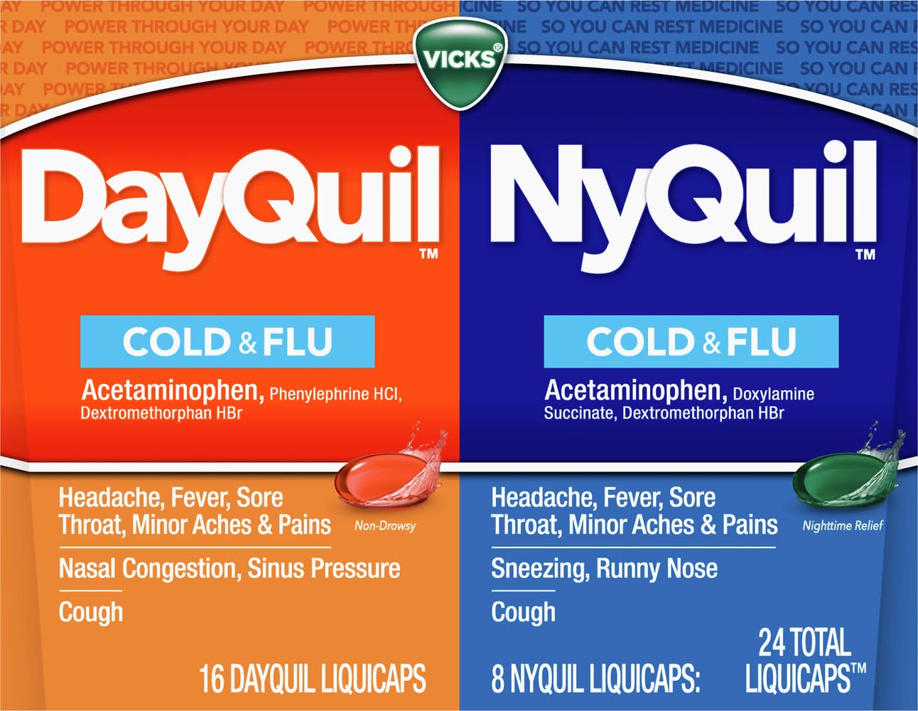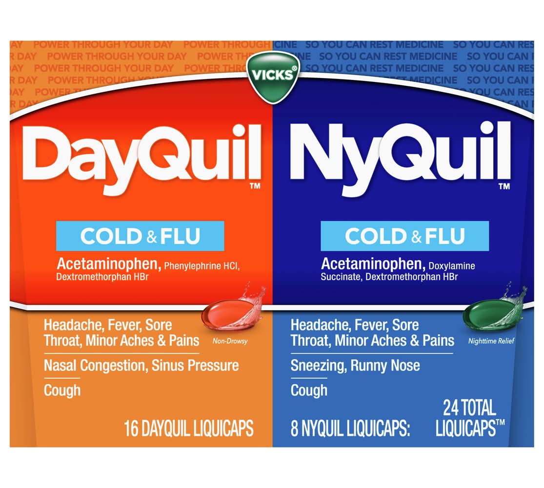 16 DayQuil liquicaps; 8 NyQuil liquicaps: 24 total liquicaps. DayQuil Cold & Flu: Acetaminophen, phenylephrine HCl, dextromethorphan HBr. NyQuil Cold & Flu: Acetaminophen, doxylamine succinate, dextromethorphan HBr. DayQuil: Acetaminophen, phenylephrine HCI, Dextromethorphan HBr. Headache, fever, sore throat, minor aches & pains. Nasal congestion, sinus pressure. Cough. Non-drowsy. NyQuil: Acetaminophen, Doxylamine succinate, Dextromethorphan HBr. Headache, fever, sore throat, minor aches & pains. Sneezing, runny nose. Cough. Nighttime relief. Made in Canada. Procter & Gamble, Cincinnati, OH, 45202