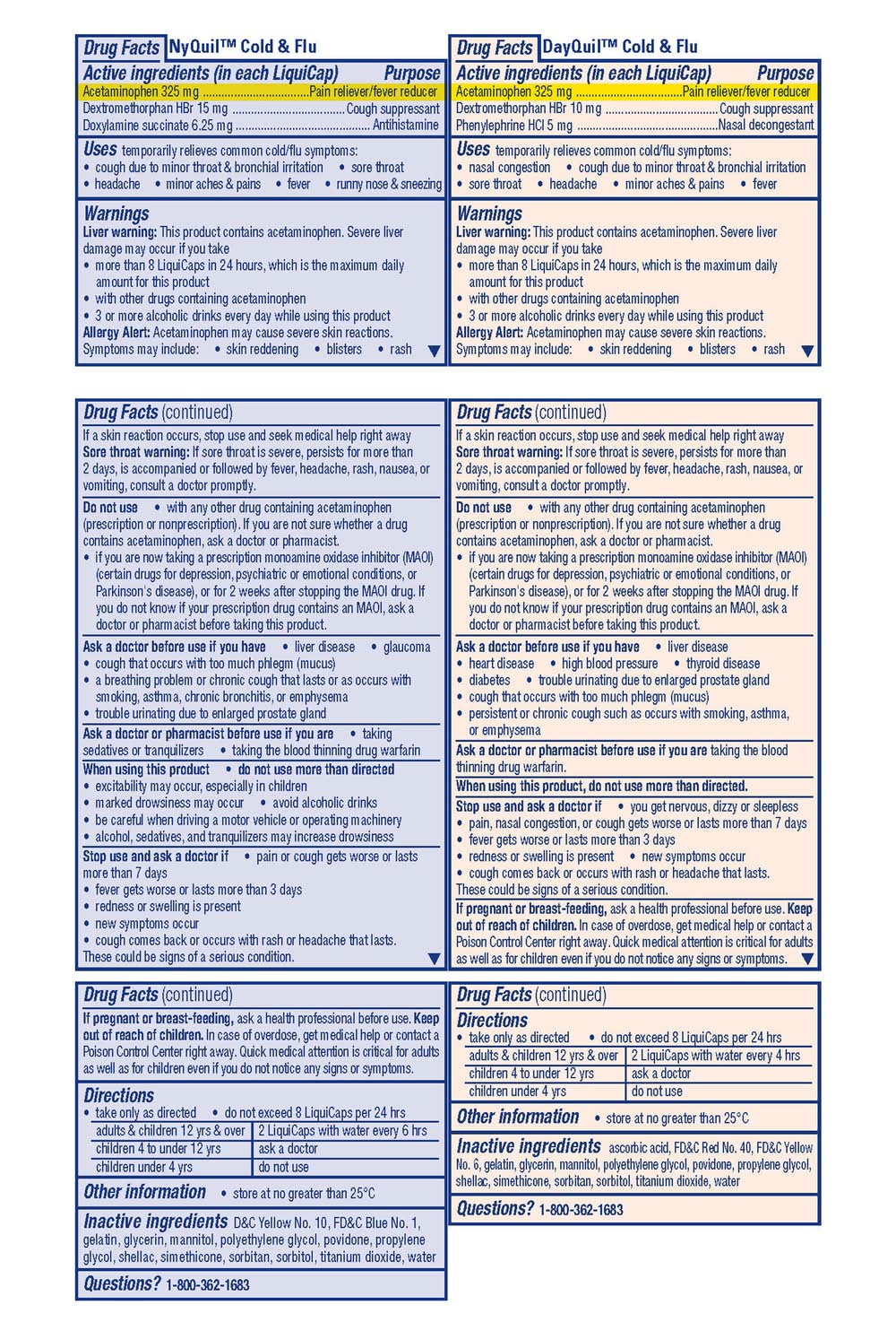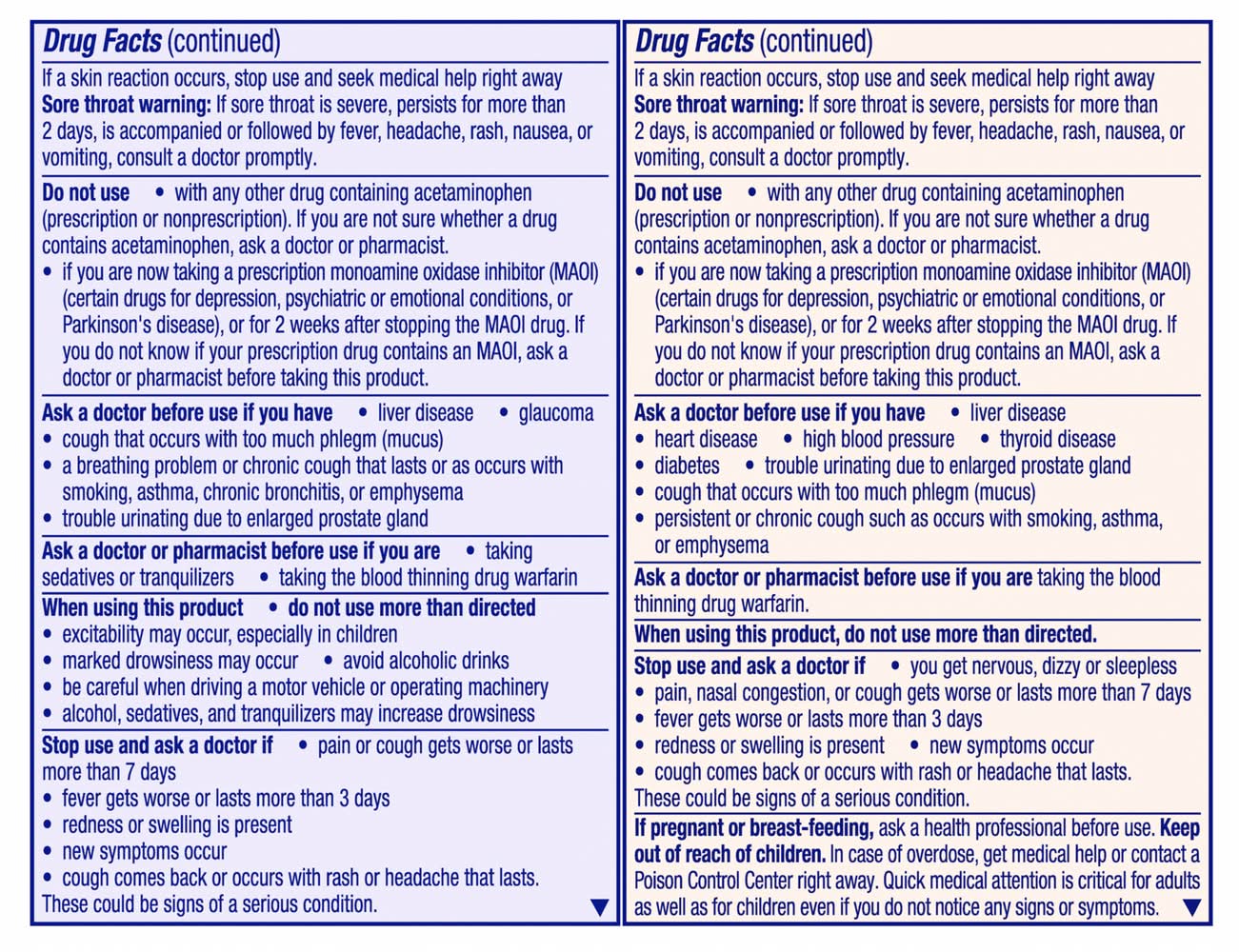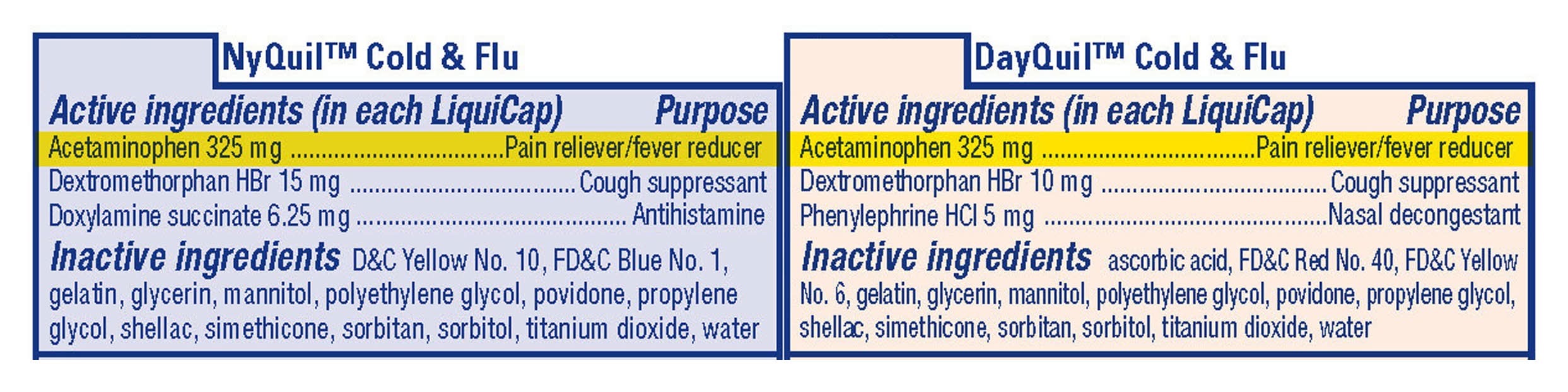 Ingredients: In Each LiquiCap. Active Ingredients: Acetaminophen (325 mg), Pain reliever/fever reducer; Dextromenthorphan HBr (15 mg), Cough Suppressant; Doxylamine Succinate (6.25 mg), Antihistamine. Inactive Ingredients: D&C Yellow No. 10, FD&C Blue No. 1, Gelatin, Glycerin, Mannitol, Polyethylene Glycol, Povidone, Propylene Glycol, Shellac, Simethicone, Sorbitan, Sorbitol, Titanium Dioxide, Water. In Each LiquiCap. Active Ingredients: Acetaminophen (325 mg), Pain reliever/fever reducer; Dextromenthorphan HBr (10 mg), Cough Suppressant; Phenylephrine HCI (5 mg), Nasal Decongestant. Inactive Ingredients: Ascorbic Acid, FD&C Red No. 40, FD&C Yellow No. 6, Gelatin, Glycerin, Mannitol, Polyethylene Glycol, Povidone, Propylene Glycol, Shellac, Simethicone, Sorbitan, Sorbitol, Titanium Dioxide, Water. In Each LiquiCap. Active Ingredients: Acetaminophen (325 mg), Pain reliever/fever reducer; Dextromenthorphan HBr (15 mg), Cough Suppressant; Doxylamine Succinate (6.25 mg), Antihistamine. Inactive Ingredients: D&C Yellow No. 10, FD&C Blue No. 1, Gelatin, Glycerin, Mannitol, Polyethylene Glycol, Povidone, Propylene Glycol, Shellac, Simethicone, Sorbitan, Sorbitol, Titanium Dioxide, Water. In Each LiquiCap. Active Ingredients: Acetaminophen (325 mg), Pain reliever/fever reducer; Dextromenthorphan HBr (10 mg), Cough Suppressant; Phenylephrine HCI (5 mg), Nasal Decongestant. Inactive Ingredients: Ascorbic Acid, FD&C Red No. 40, FD&C Yellow No. 6, Gelatin, Glycerin, Mannitol, Polyethylene Glycol, Povidone, Propylene Glycol, Shellac, Simethicone, Sorbitan, Sorbitol, Titanium Dioxide, Water