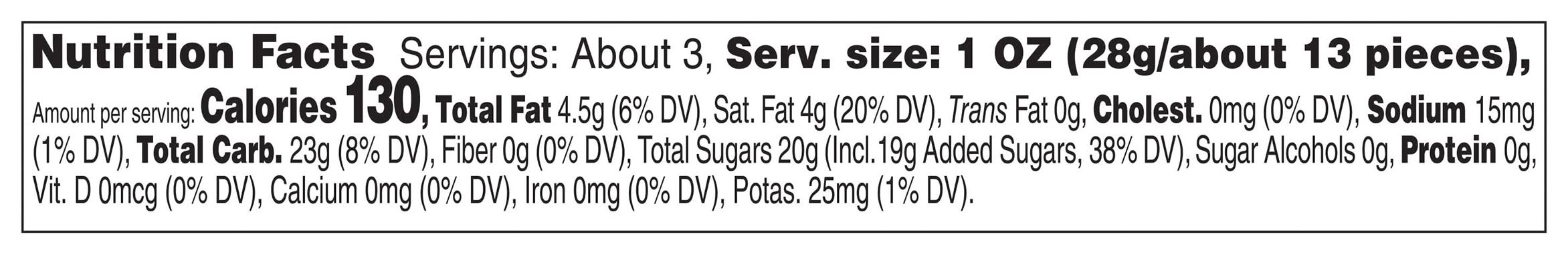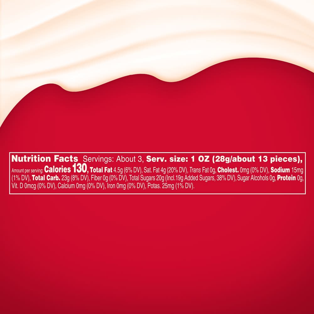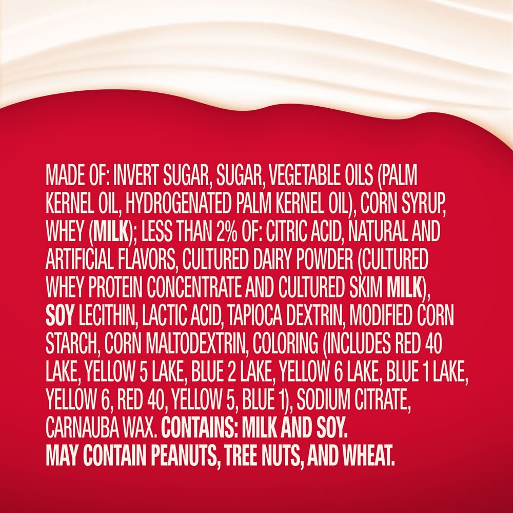 Ingredients: Invert Sugar, Sugar, Vegetable Oils (Palm Kernel Oil, Hydrogenated Palm Kernel Oil), Corn Syrup, Whey (Milk); Less than 2% of: Citric Acid, Natural and Artificial Flavors, Cultured Dairy Powder (Cultured Whey Protein Concentrate and Cultured Skim Milk), Soy Lecithin, Lactic Acid, Tapioca Dextrin, Modified Corn Starch, Corn Maltodextrin, Coloring (Includes Red 40 Lake, Yellow 5 Lake, Blue 2 Lake, Yellow 6 Lake, Blue 1 Lake, Yellow 6, Red 40, Yellow 5, Blue 1), Sodium Citrate, Carnauba Wax. Contains: Contains: Milk and soy.\nMay contain peanuts, tree nuts, and wheat.