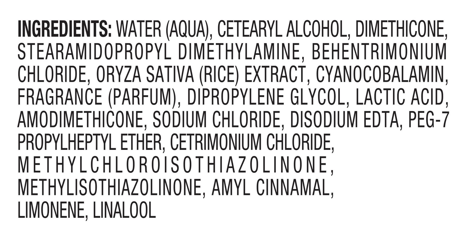 WATER (AQUA), CETEARYL ALCOHOL, DIMETHICONE, STEARAMIDOPROPYL DIMETHYLAMINE, BEHENTRIMONIUM CHLORIDE, ORYZA SATIVA (RICE) EXTRACT, CYANOCOBALAMIN, FRAGRANCE (PARFUM), DIPROPYLENE GLYCOL, LACTIC ACID, AMODIMETHICONE, SODIUM CHLORIDE, DISODIUM EDTA, PEG-7 PROPYLHEPTYL ETHER, CETRIMONIUM CHLORIDE, METHYLCHLOROISOTHIAZOLINONE, METHYLISOTHIAZOLINONE, AMYL CINNAMAL, LIMONENE, LINALOOL