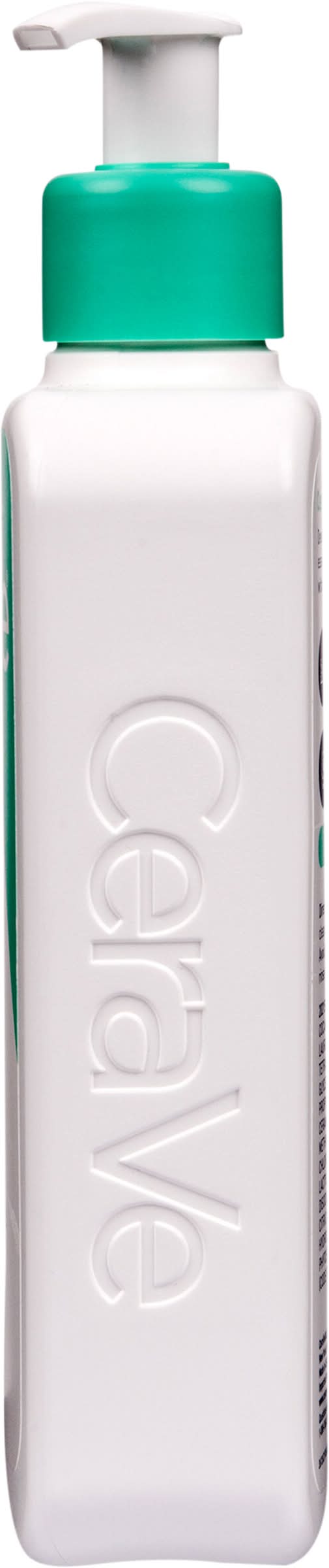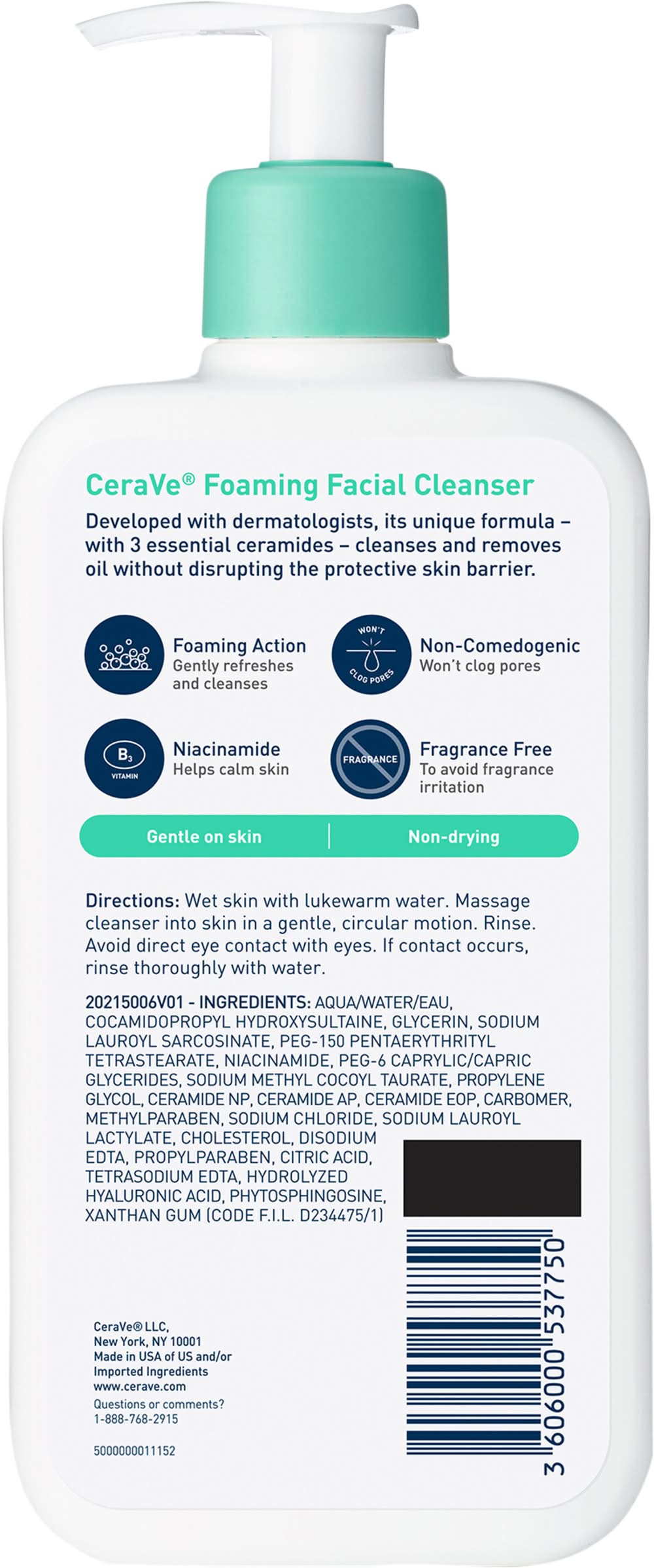 CERAVE FOAMING FACIAL CLEANSER Developed with dermatologists, CeraVe Foaming Facial Cleanser has a unique formula with three essential ceramides (1, 3, 6-II) that cleanses and removes oil without disrupting the protective skin barrier. Gentle foaming action refreshes and cleanses skin, including removing excess oils. Suitable for daily cleansing morning (AM) and night (PM) for normal to oily skin as a facial cleanser, body wash and/or hand soap. • Made for normal to oily skin. • Suitable for adults and children (3+ years). Unisex • Fragrance-free and paraben-free • Non-comedogenic (meaning it won't clog pores), non-drying, and non-irritating Our new CeraVe bottles, contain the same Developed with Dermatologists formulas you know and love and the same amount. The bottles are now made with LESS plastic and 100% Recycled plastic (excluding the pump). The 8oz and 12oz bottle sizes contain 17% and 21%less plastic compared to the current bottles, respectively. *Packaging contains recycled content - CeraVe's Foaming Facial Cleanser 8oz and 12oz bottles are made from 100% post-consumer recycled content (PCR) excluding the pump. • CeraVe LLC, New York,NY,10001 • Packaging: Reusable