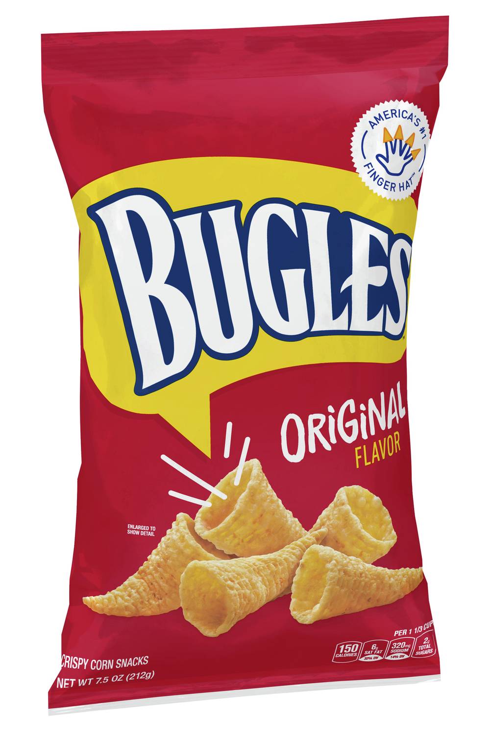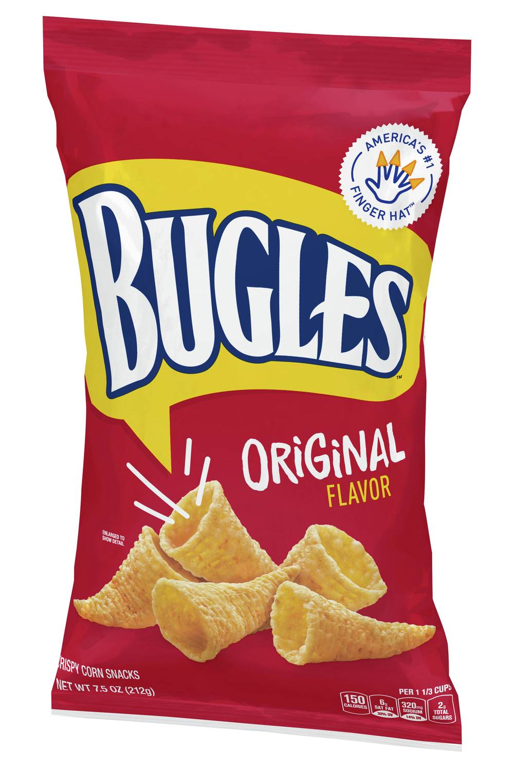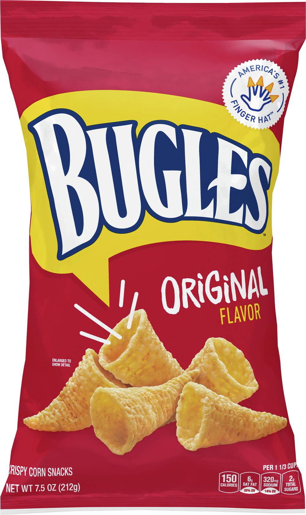 Cone shaped corn snacks. Bugles is the original, distinctive cone shaped snack with a great taste and crunch. • Flavor: • General Mills, Box 200 Minneapolis, MN 55440