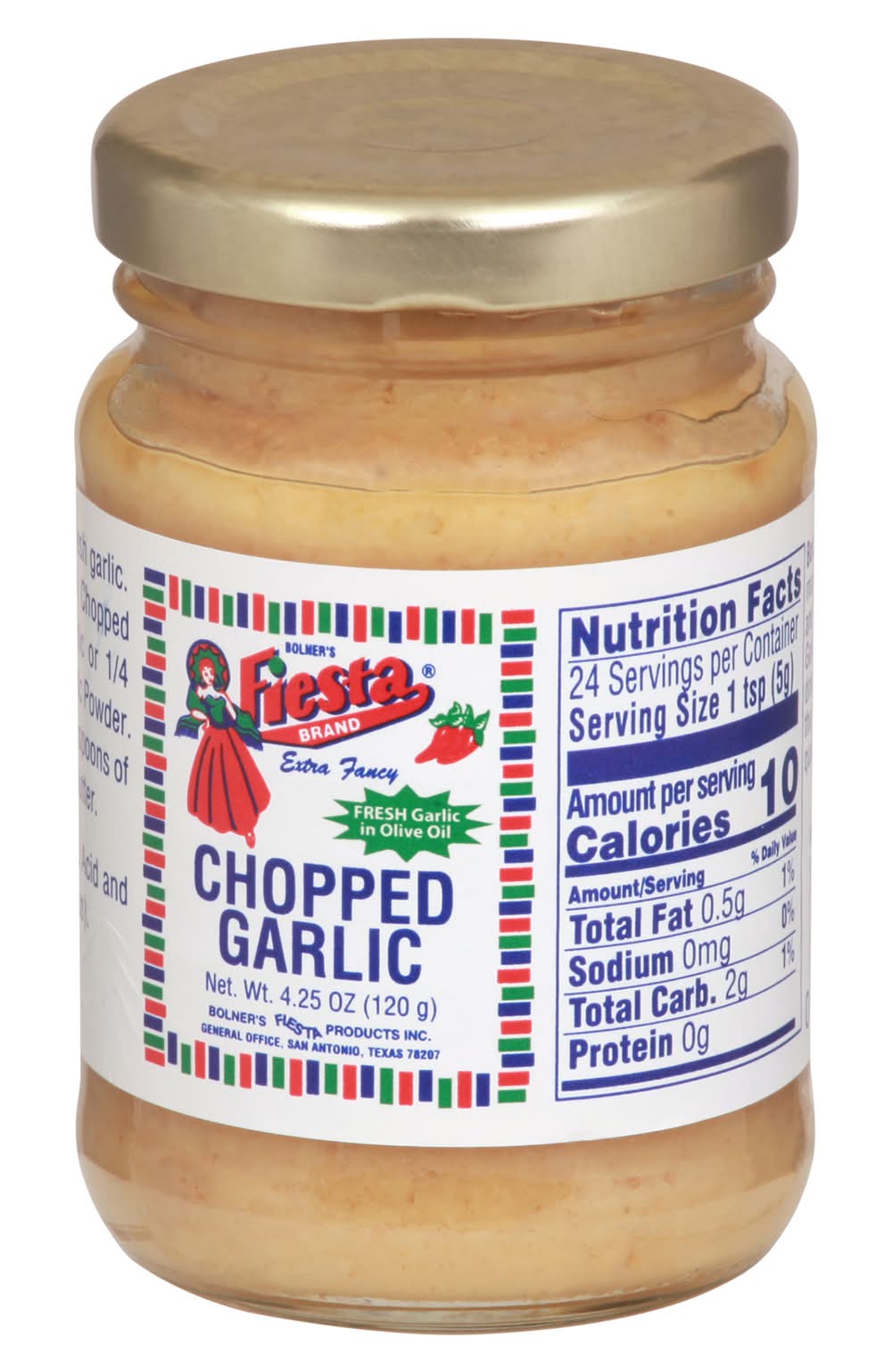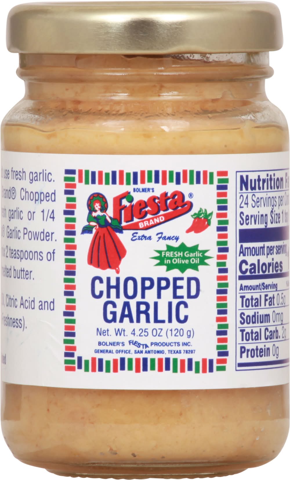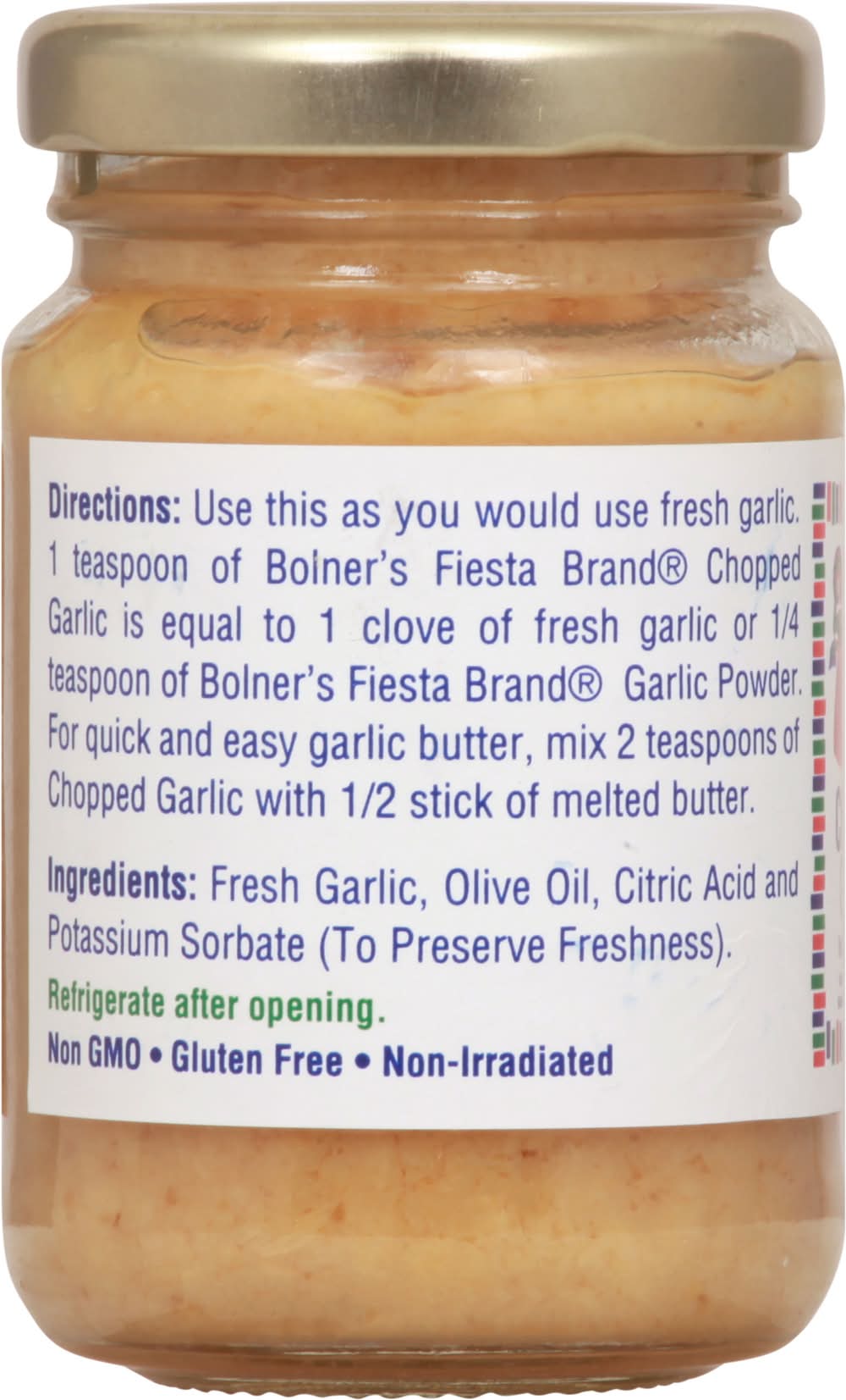Fresh garlic in olive oil. Gluten free. Non GMO. Non-Irradiated. Bolner's Fiesta Brand is the mark of quality in garlic, spices and seasonings. Our Chopped Garlic is made from Fresh, never dried California Garlic to ensure that it is the best tasting, highest quality product available. www.fiestaspices.com. Bolner's Fiesta Products,