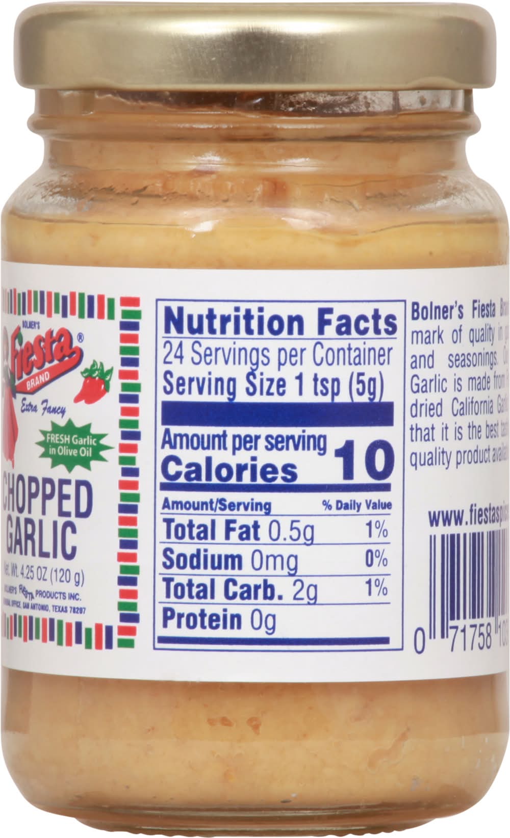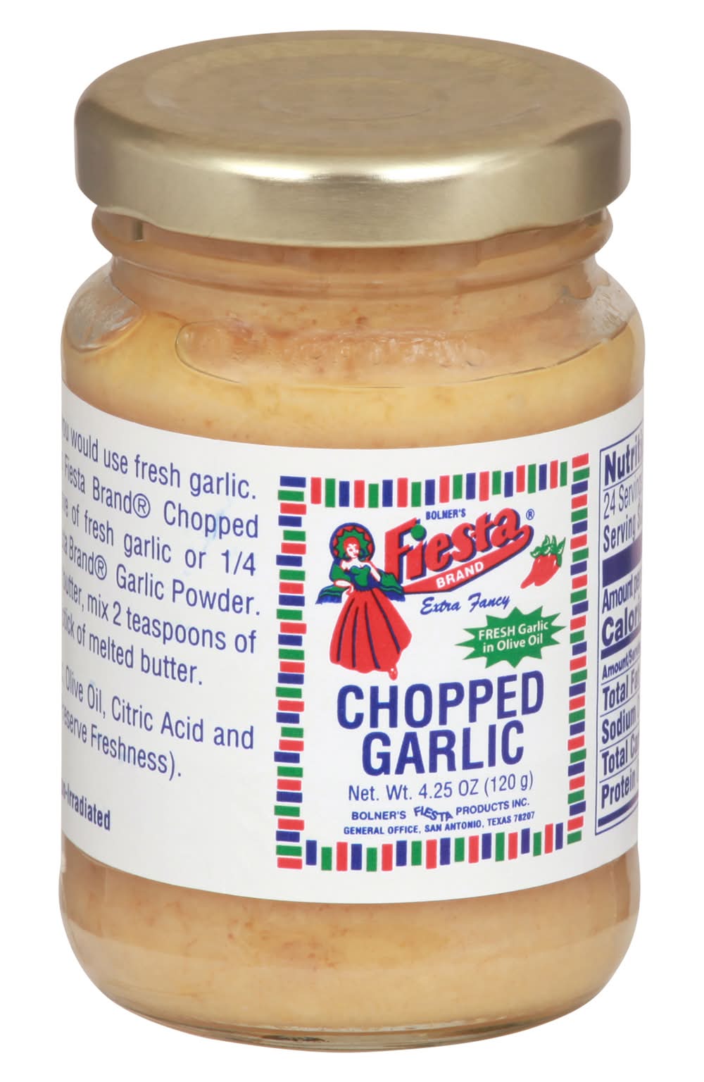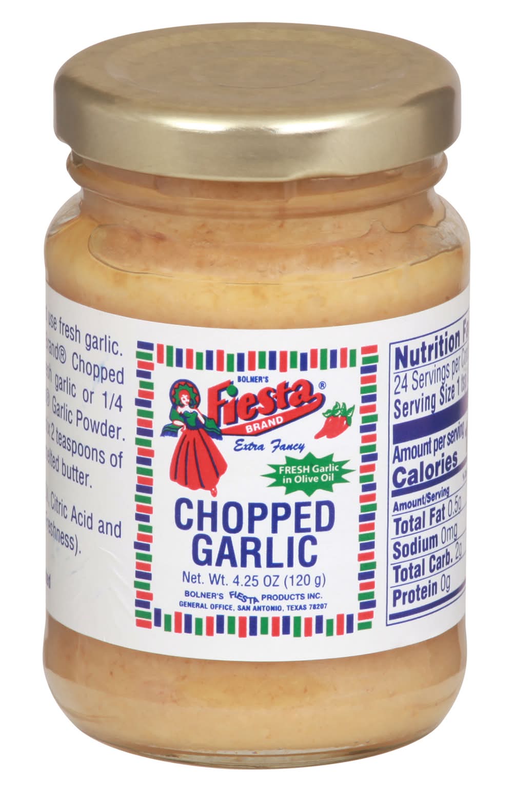 Fresh garlic in olive oil. Gluten free. Non GMO. Non-Irradiated. Bolner's Fiesta Brand is the mark of quality in garlic, spices and seasonings. Our Chopped Garlic is made from Fresh, never dried California Garlic to ensure that it is the best tasting, highest quality product available. www.fiestaspices.com. Bolner's Fiesta Products,