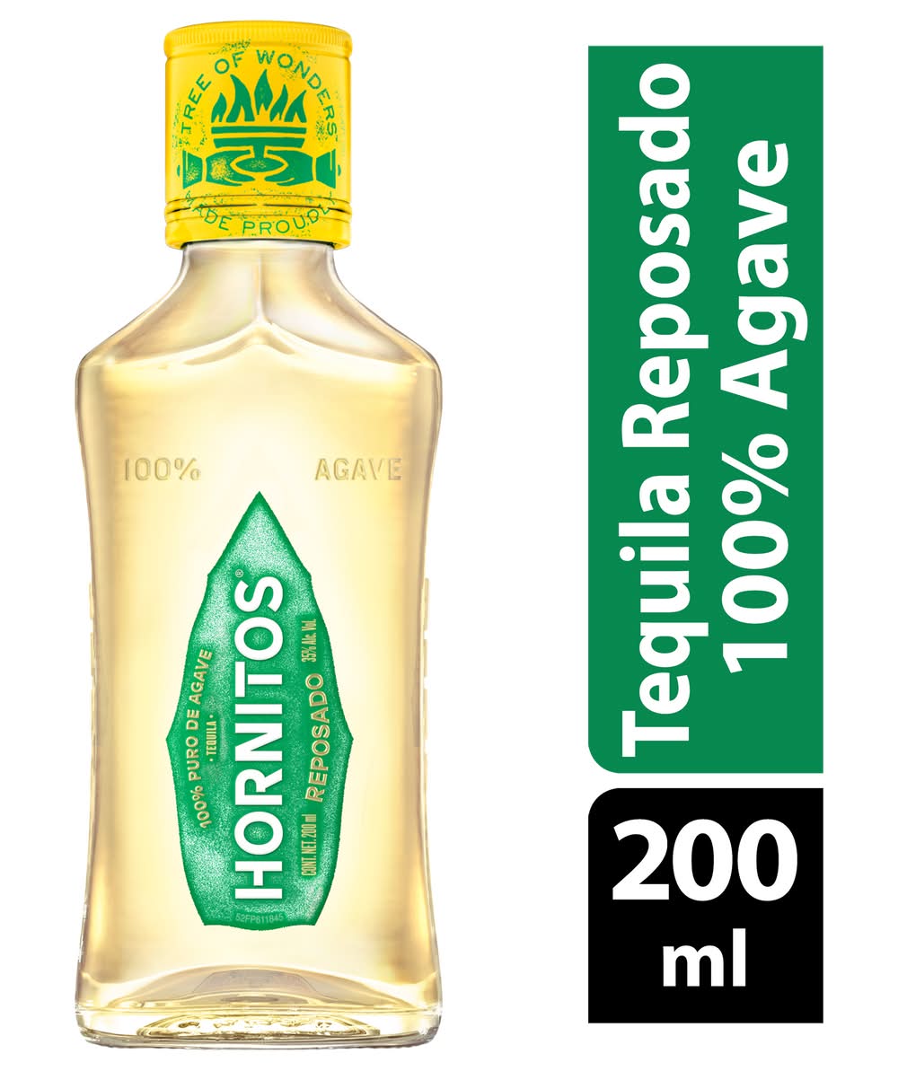 Tequila 100% Puro De Agave. Hornitos Reposado Tequila is a medium-bodied tequila proudly made in Jalisco, Mexico. Hornitos Reposado is made from 100% blue agave and aged in large oak vats for at least two months for a smooth-tasting tequila. Hornitos was introduced to the world in 1950 by founder Don Francisco Javier Sauza in honor of Mexican Independence Day. Featuring notes of apple and herbs along with a strong agave nectar flavor, this Hornitos Reposado Tequila also offers a warm and slightly astringent finish. Whether enjoyed neat, on the rocks, or in signature cocktails, such as a Margarita, Hornitos Reposado delivers bold flavor in every sip. This bottle of tequila is 40% alcohol by volume and should be enjoyed responsibly. Alcohol by volume: 40%