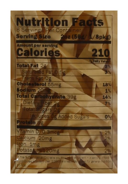 Ingredients: Extra Fancy Durum Wheat Flour, Whole Eggs, Water Contains: Eggs, Wheat